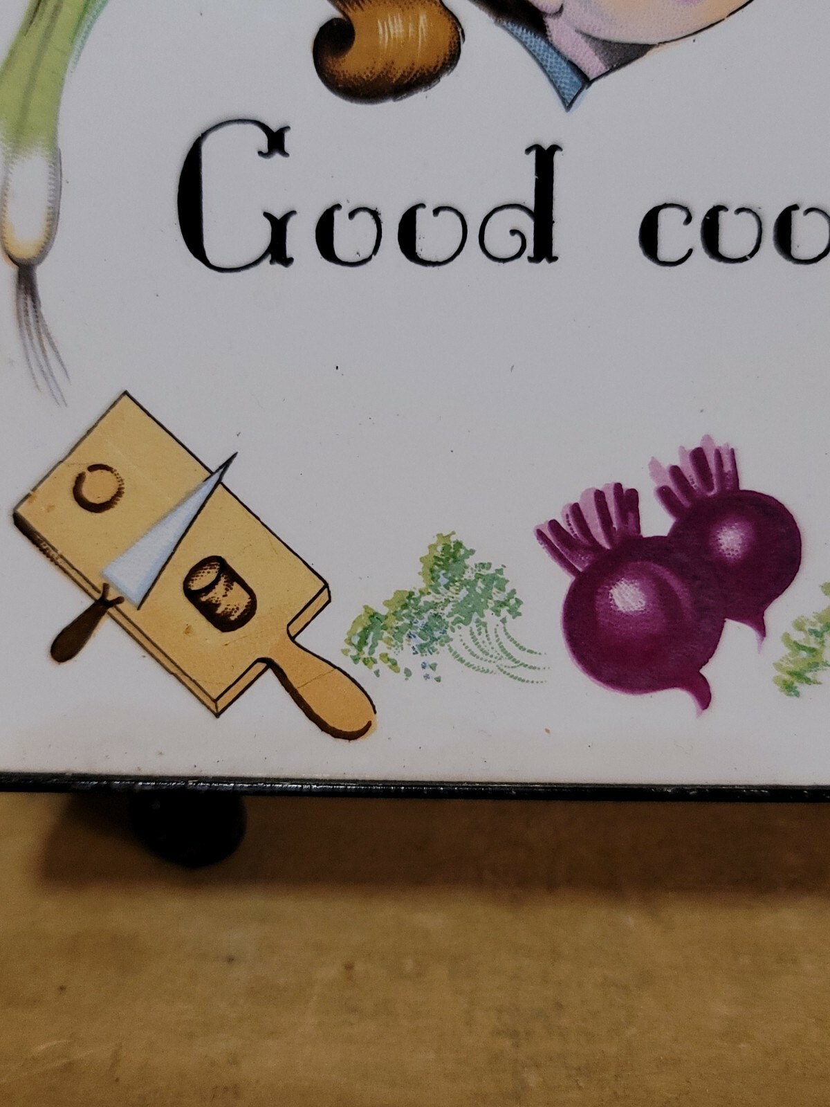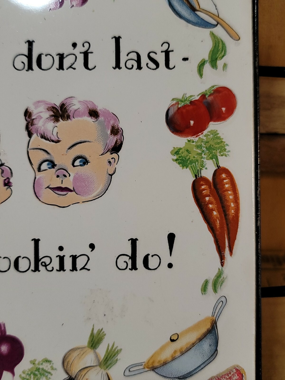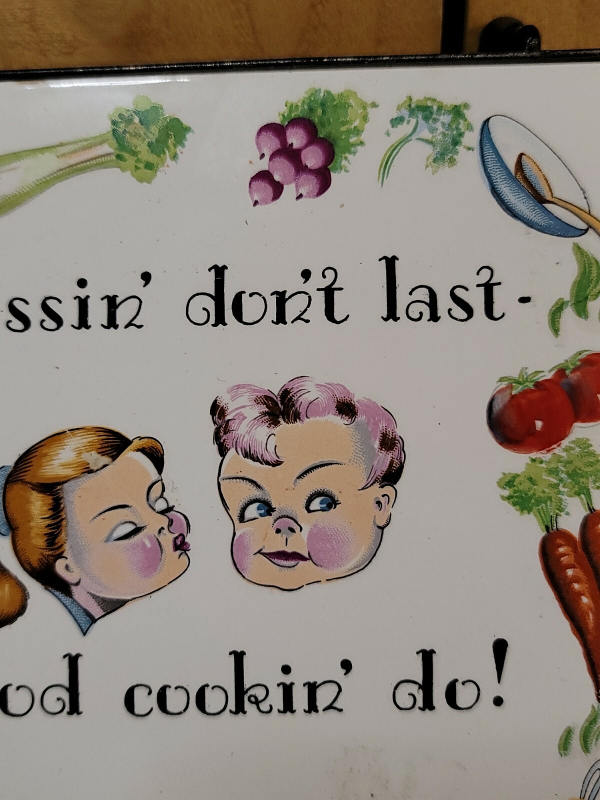 Lefton Metal Ceramic Trivet-Kissin' don't last Good cookin' do! Vintage MCM 50s