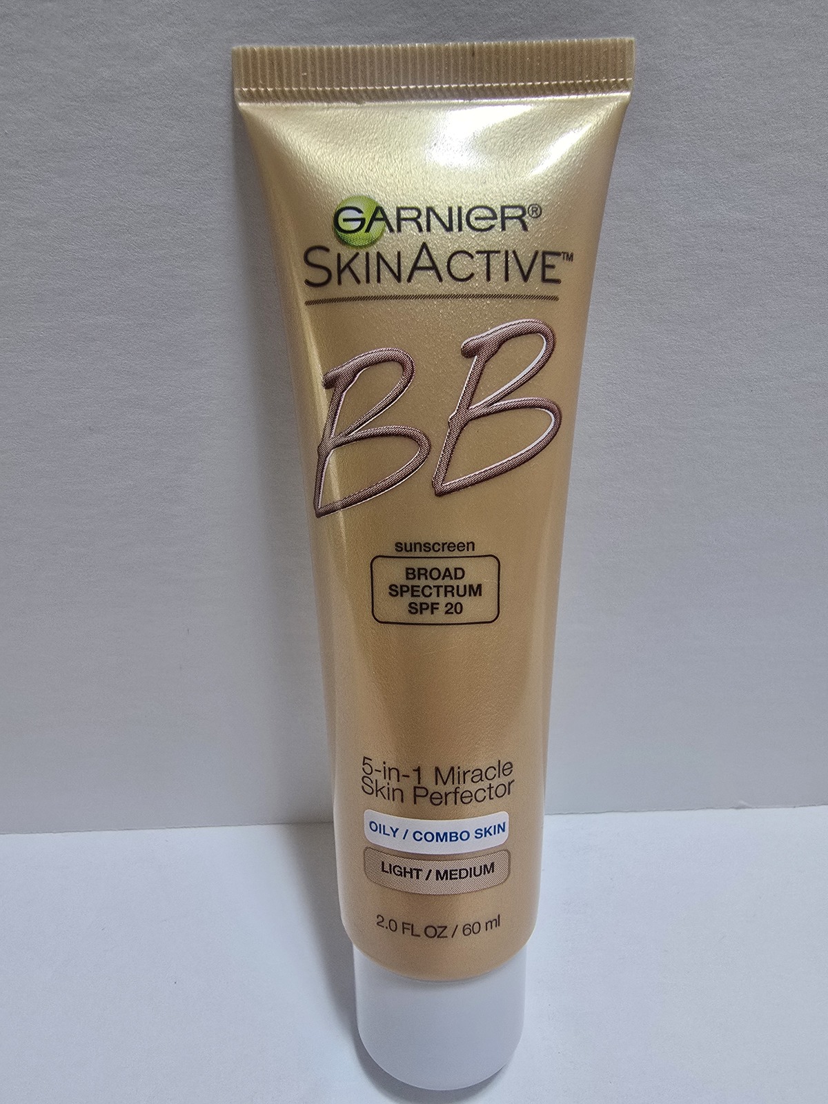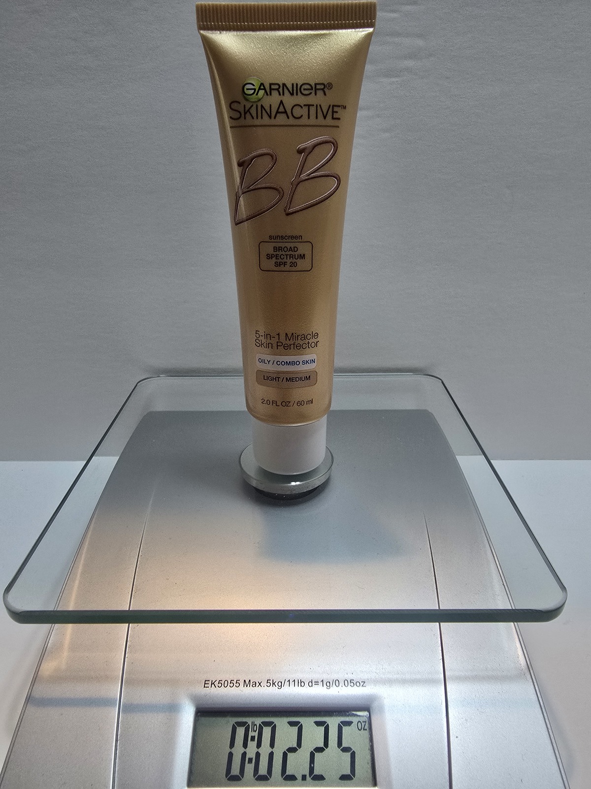 Garnier Skinactive BB Cream 5-In-1 Miracle Skin Perfector SPF 20 Oily Combo Skin 2 FL OZ Light/Medium Rare. Condition is used, and doesn't come with it's original box. The total weight of this tube should be 2.5 ounces and it weighs 2.25 ounces. It was sold to me as new, but it was probably used twice, as shown by the weight left in the tube. The consistency does sound a little more liquidy when shaken, compared to other ones I remember shaking. This is probably due the the age of this product. You won't receive the scale with this purchase, it was only used to show the amount of the product that is left. The price is high because I paid alot for this. This is a discontinued, very hard to find item.
