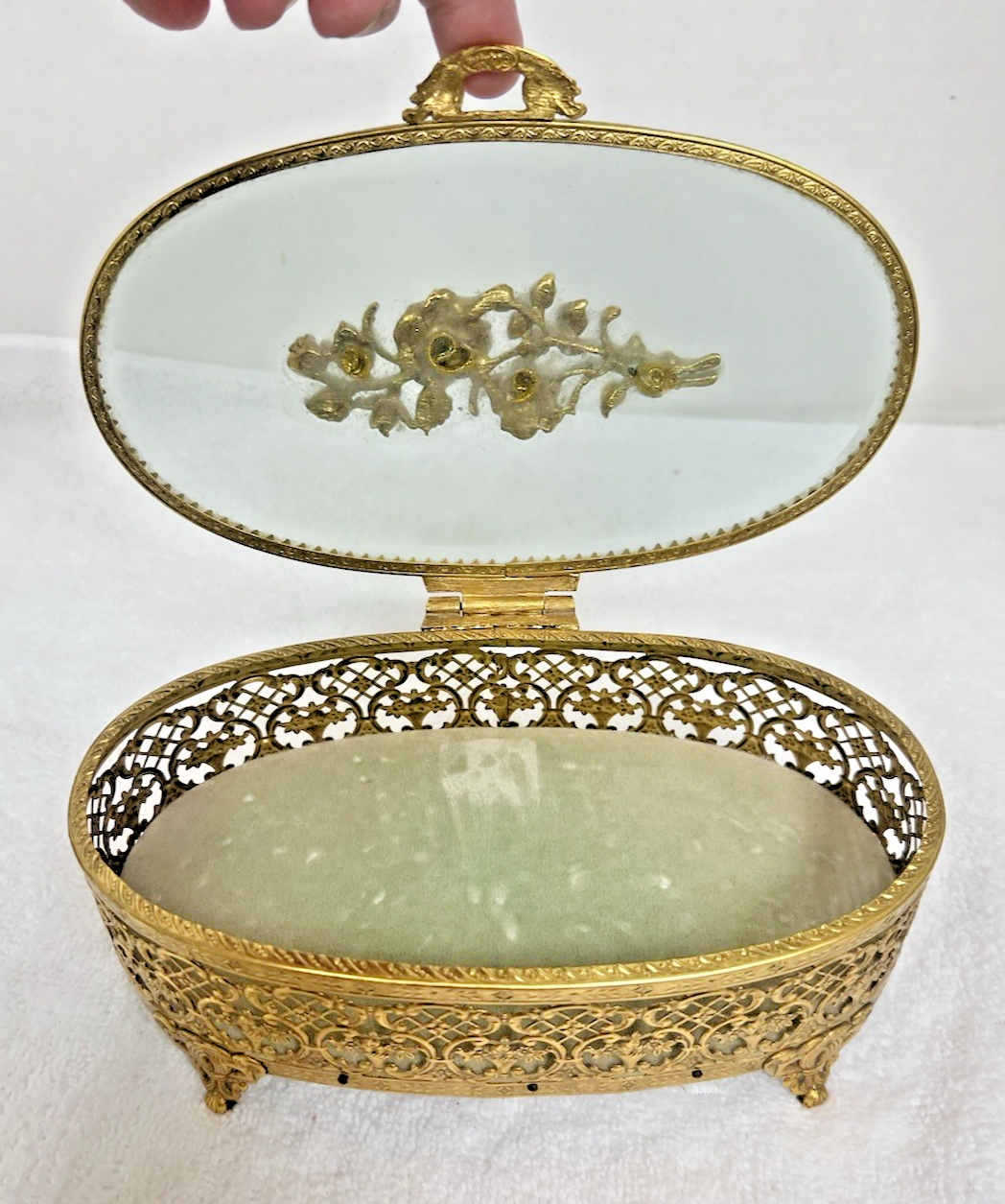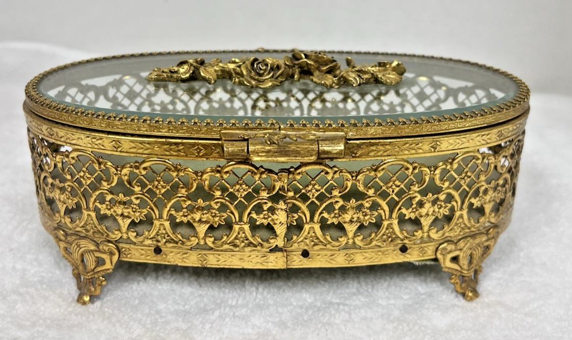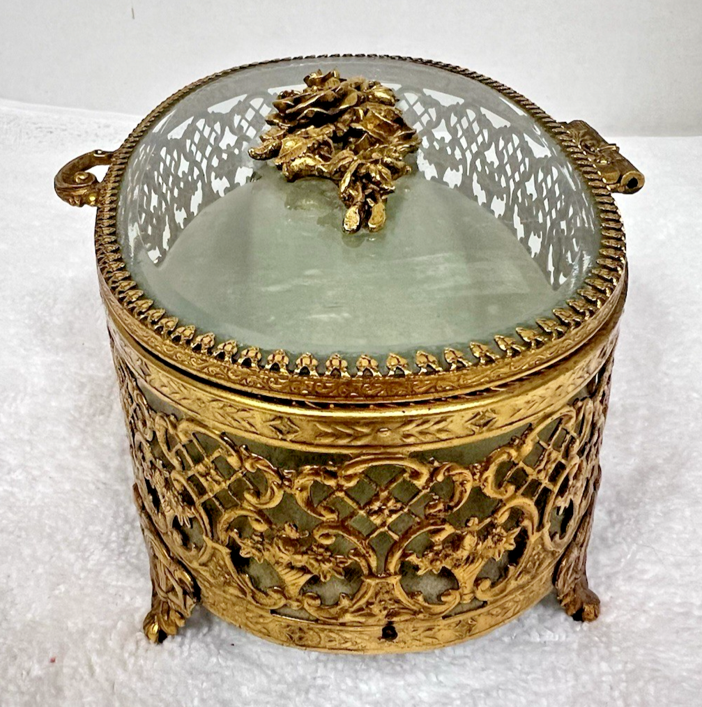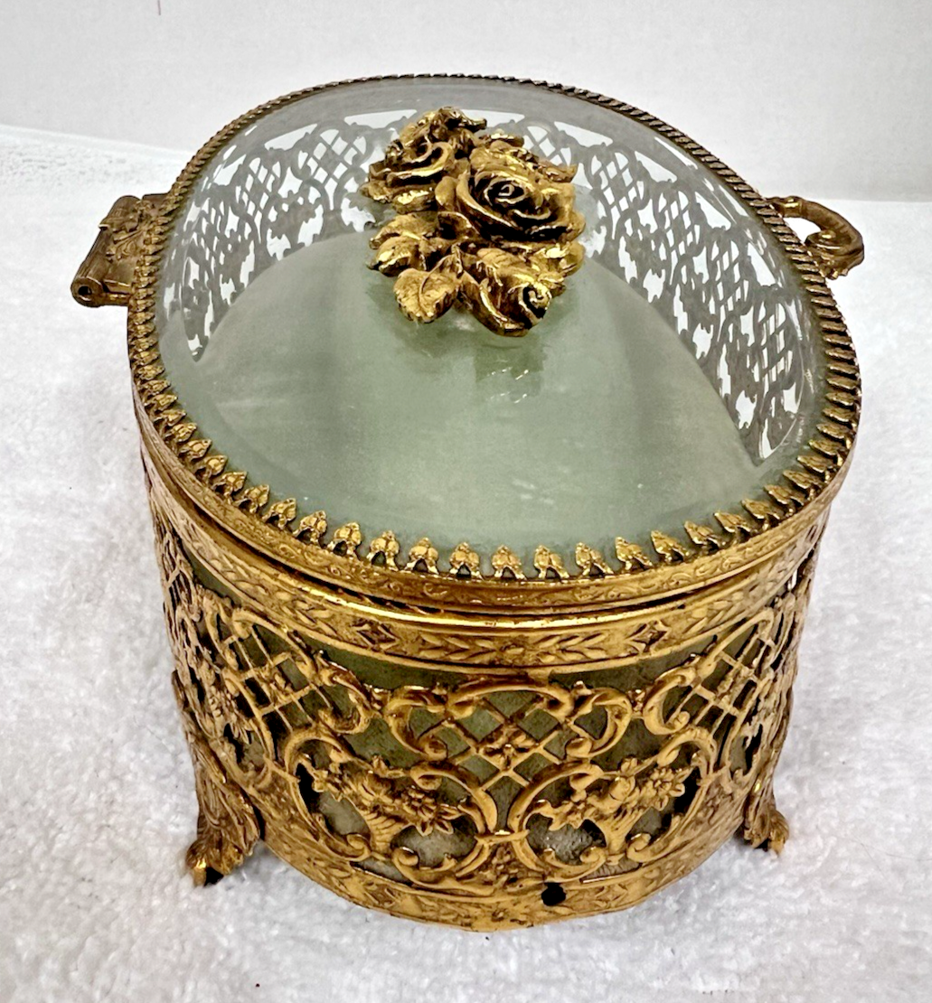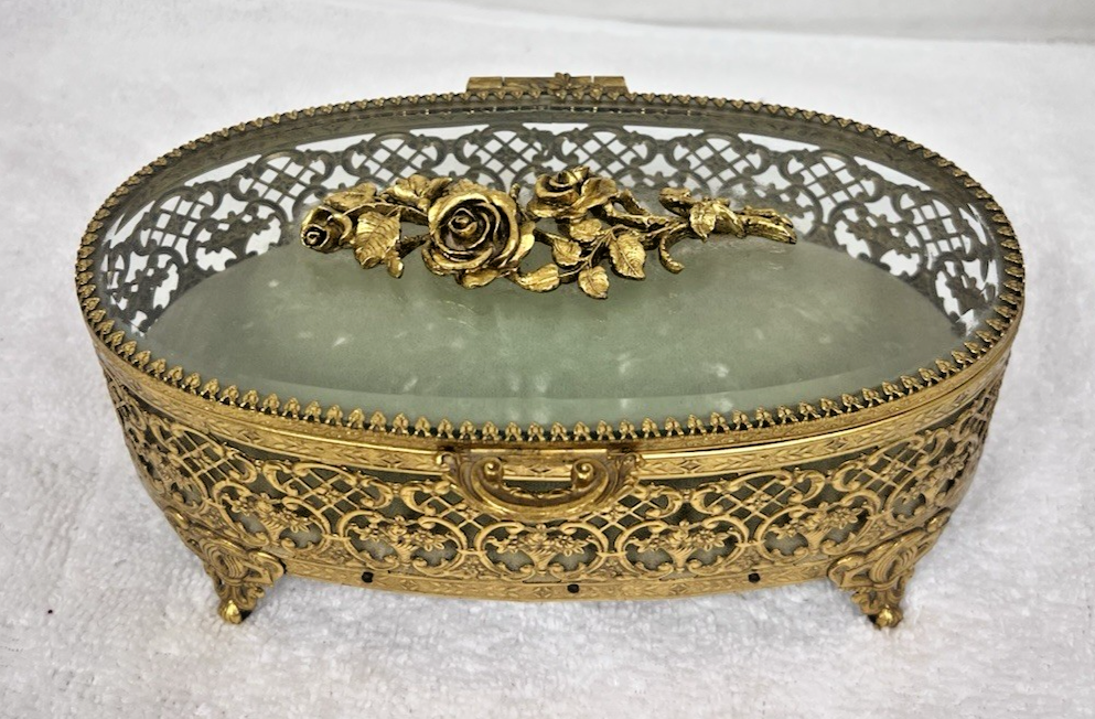 Stylebuilt NY Accessories Rose Topped Beveled Glass Casket Jewelry Display Box Oval it measures 7 5/8 wide x 5 1/4 " deep x 2 7/8 tall (to front handle) In great shape the inner fabric is light sage green and the floral basket in the design is wonderful!