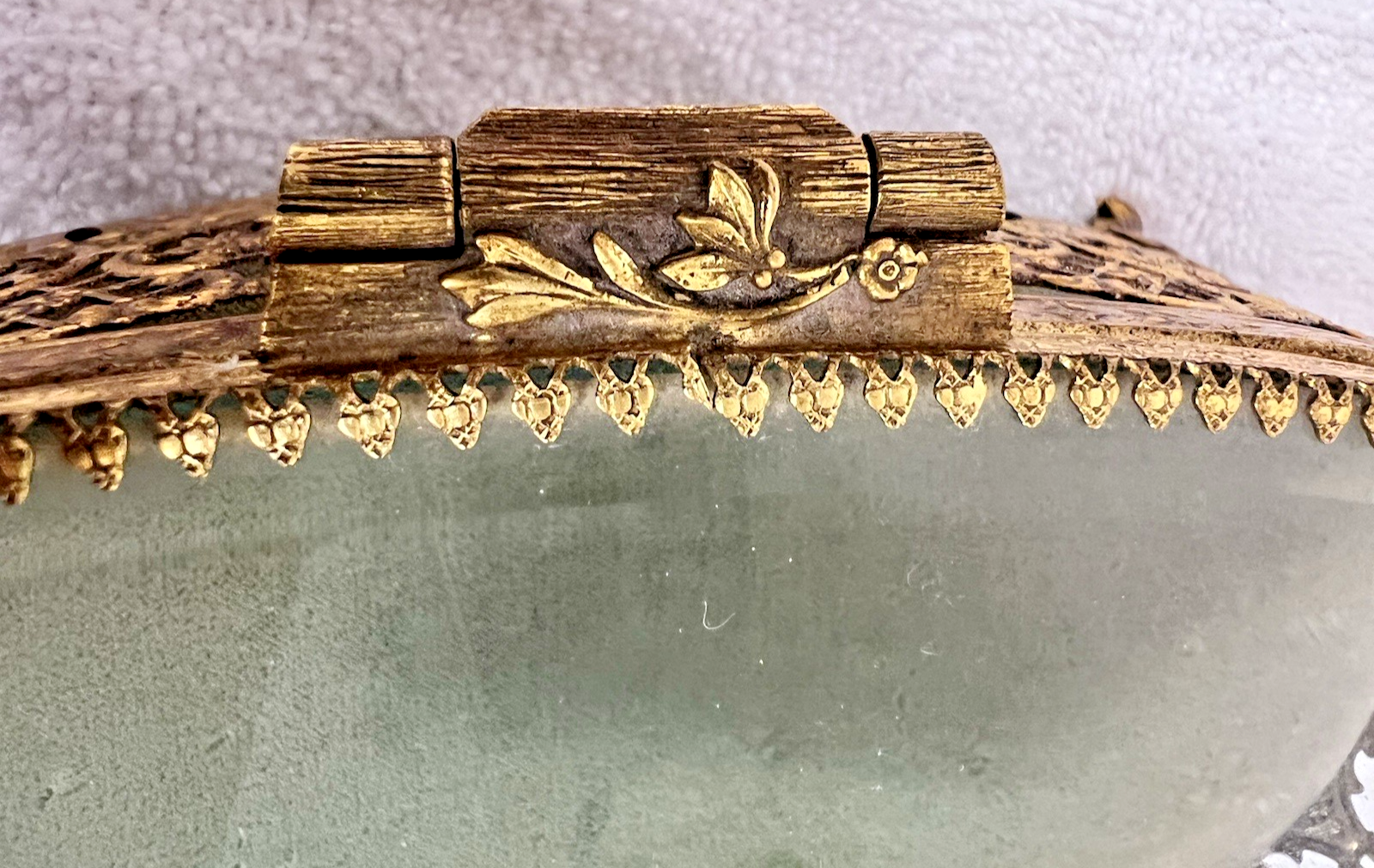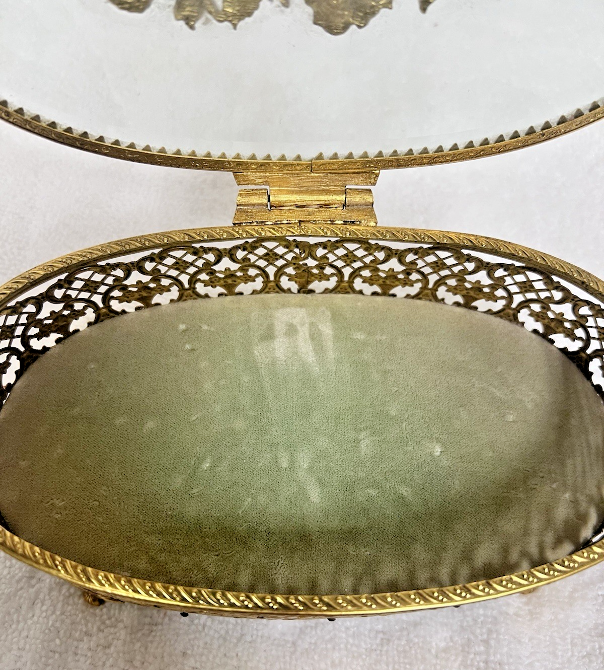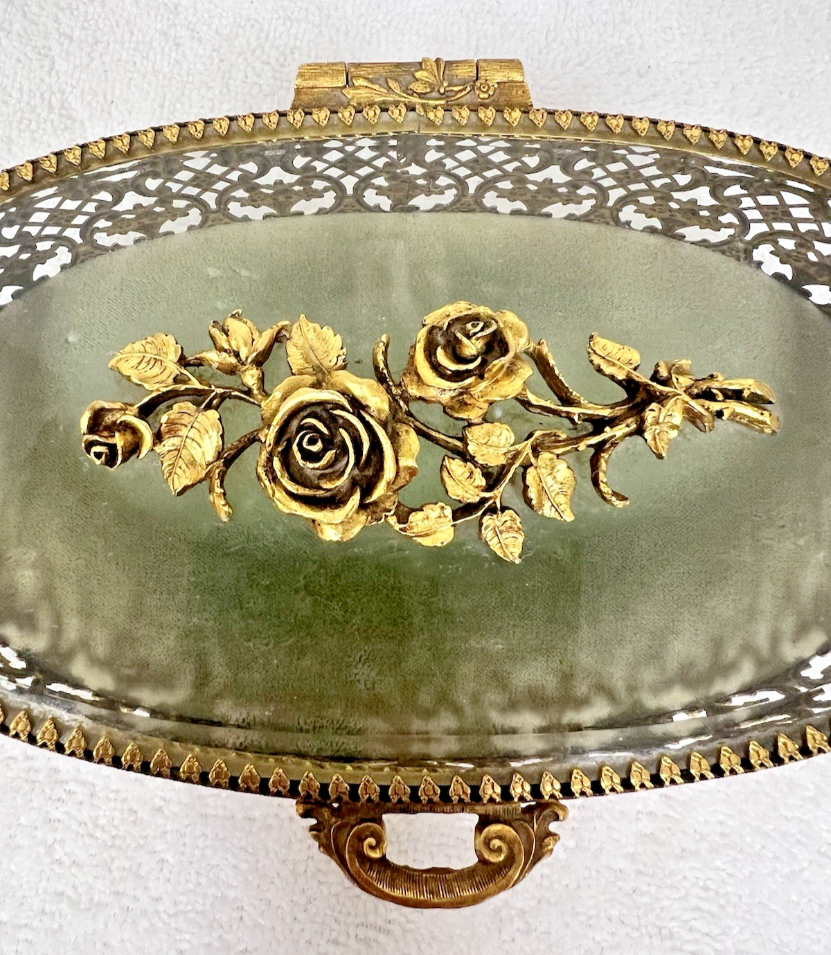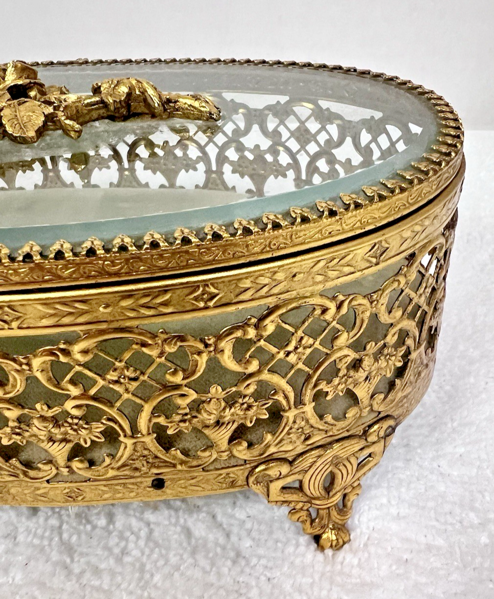 Stylebuilt NY Accessories Rose Topped Beveled Glass Casket Jewelry Display Box Oval it measures 7 5/8 wide x 5 1/4 " deep x 2 7/8 tall (to front handle) In great shape the inner fabric is light sage green and the floral basket in the design is wonderful!