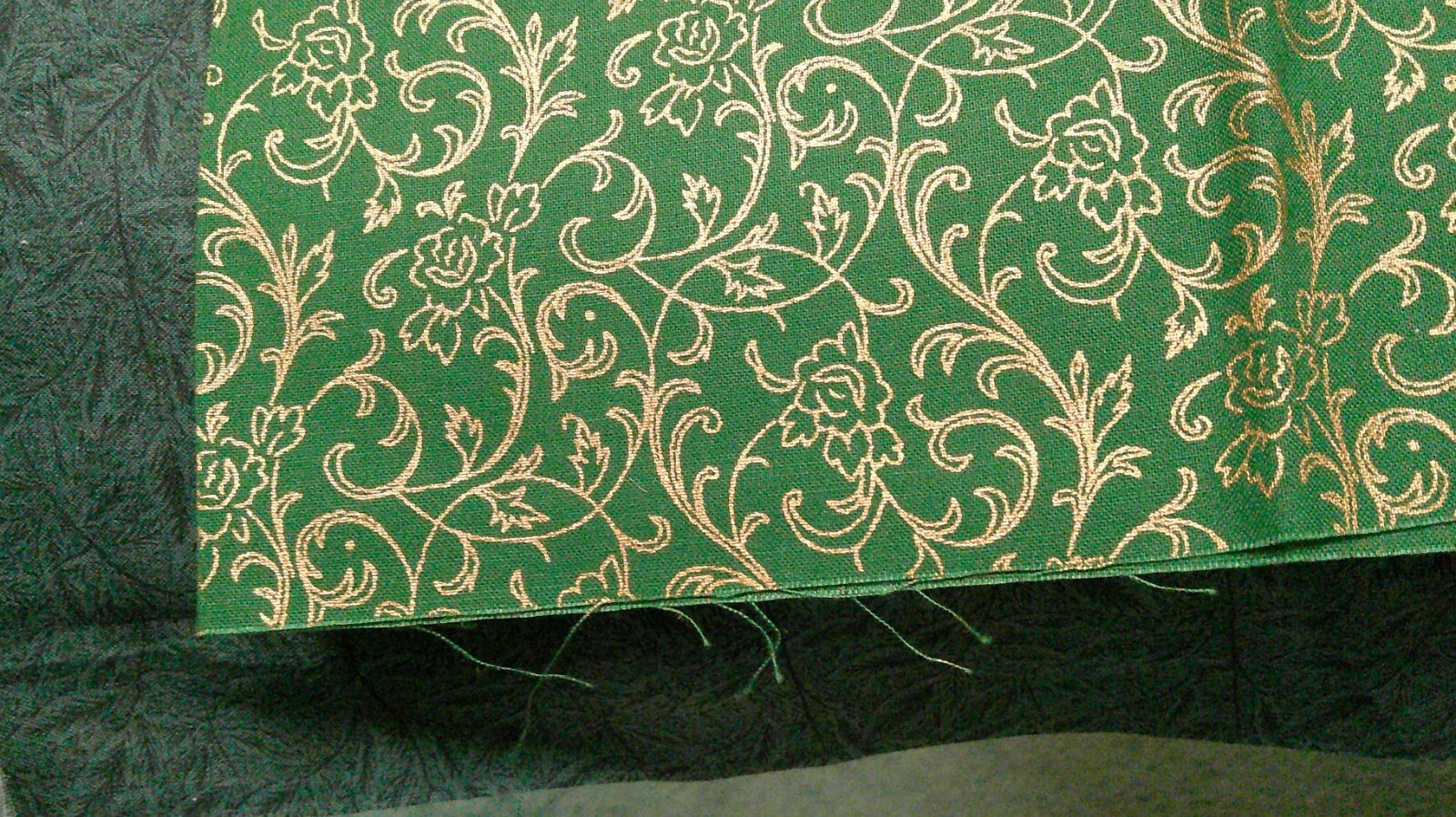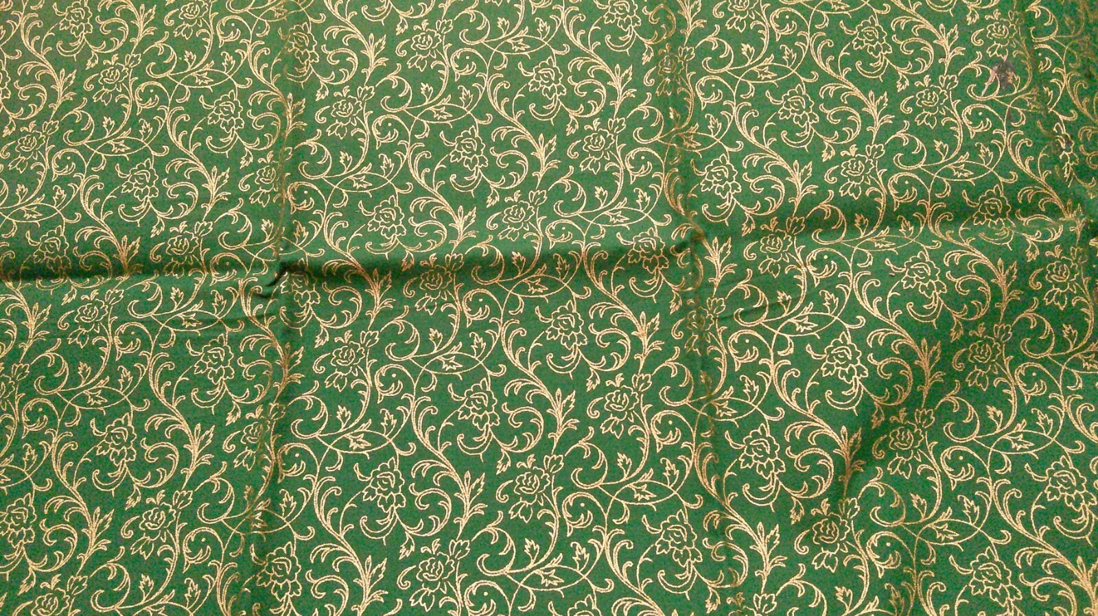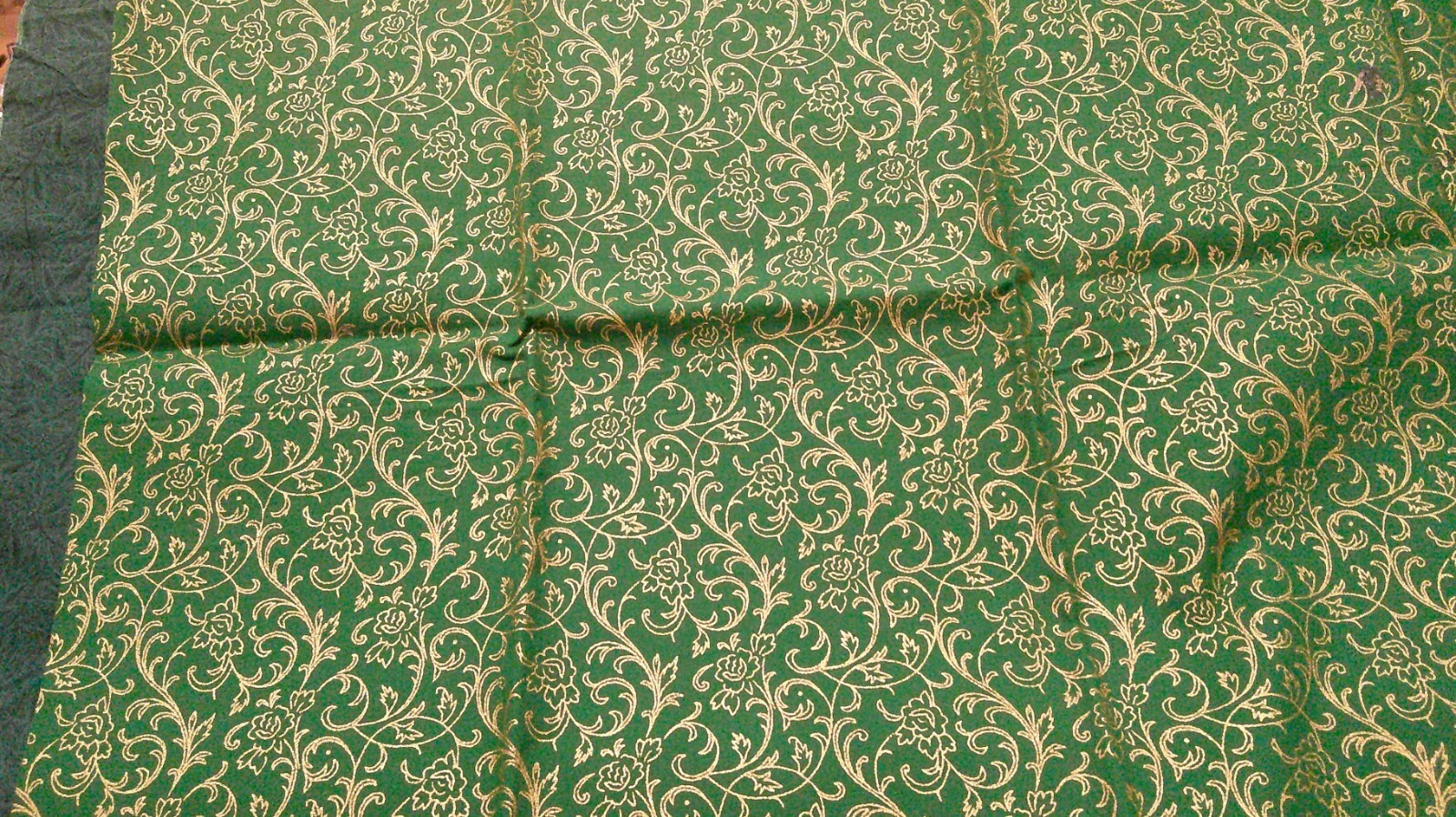 This fabric listing is by Hoffman featuring jade green material covered with gold embellished flowers so typical of Hoffman. This measures 38" x 14".