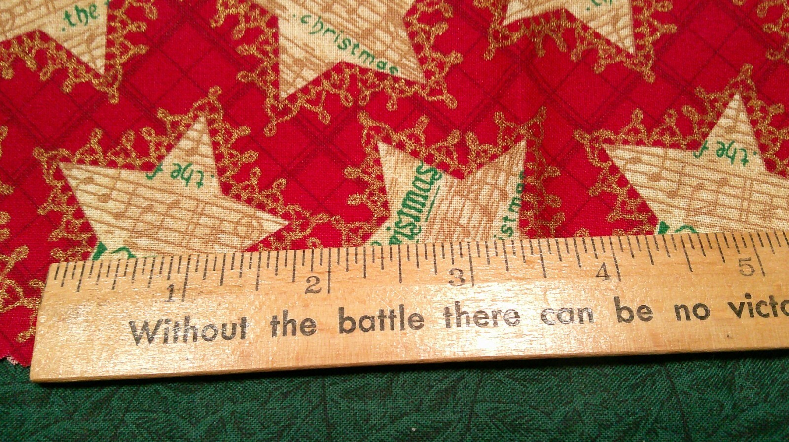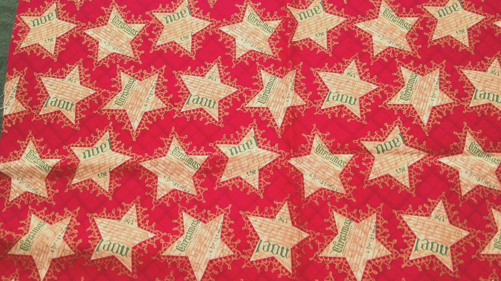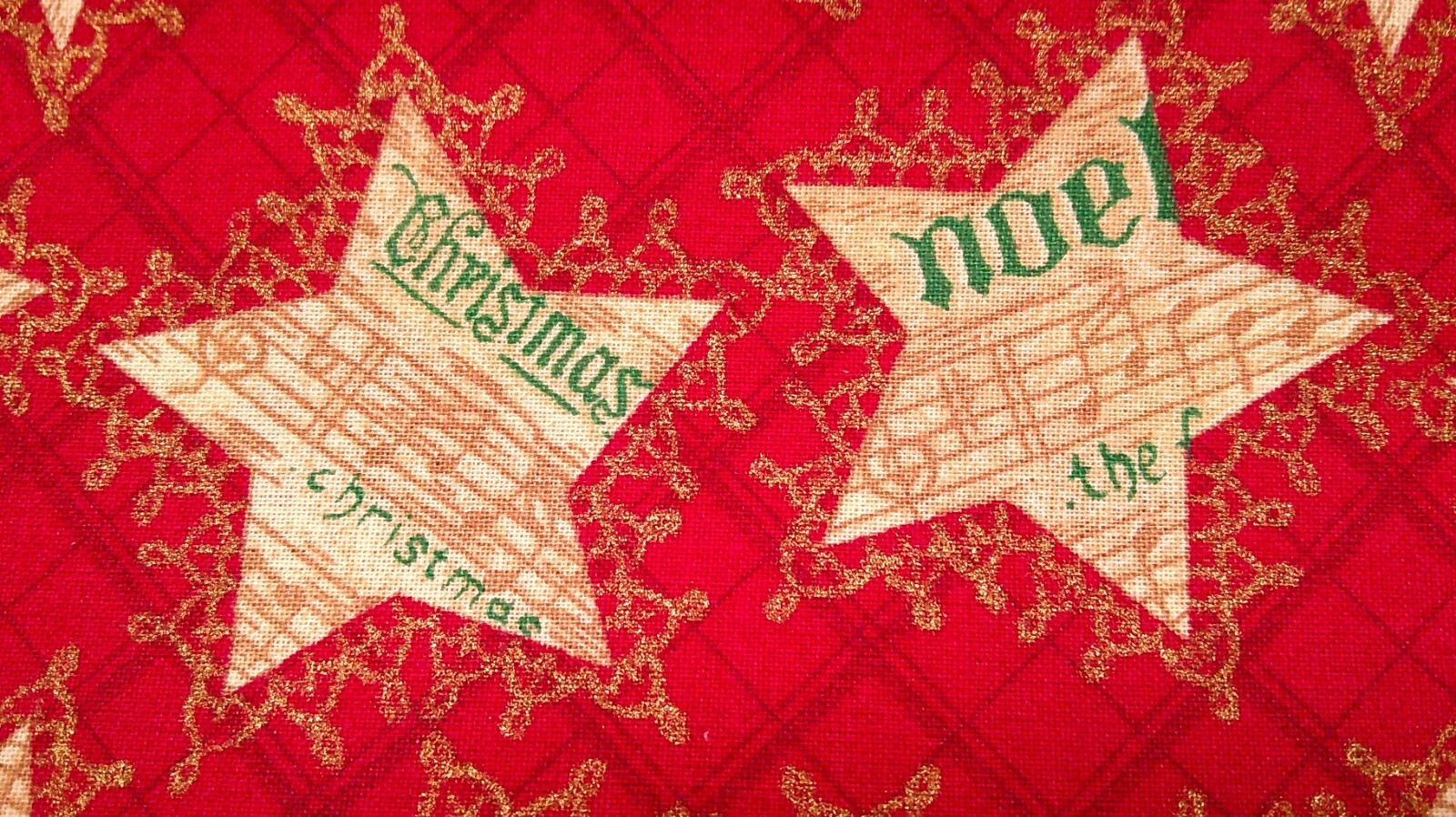 This fabric listing is by Hoffman that features musical stars with tan notes on a red background outlined with gold sparkle. This measures approximately 40" x 14" and would look nice with autumn on the reverse as a table runner.