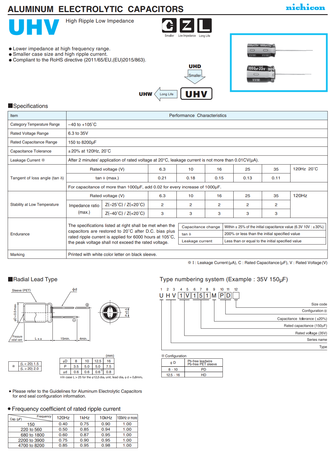 10 Pieces - UHE1C332MHD Nichicon 3300uF 16V 12.5x35.5mm Aluminum Electrolytic Radial Capacitor LS:5mm 10000h 105C Low Impedance High Ripple