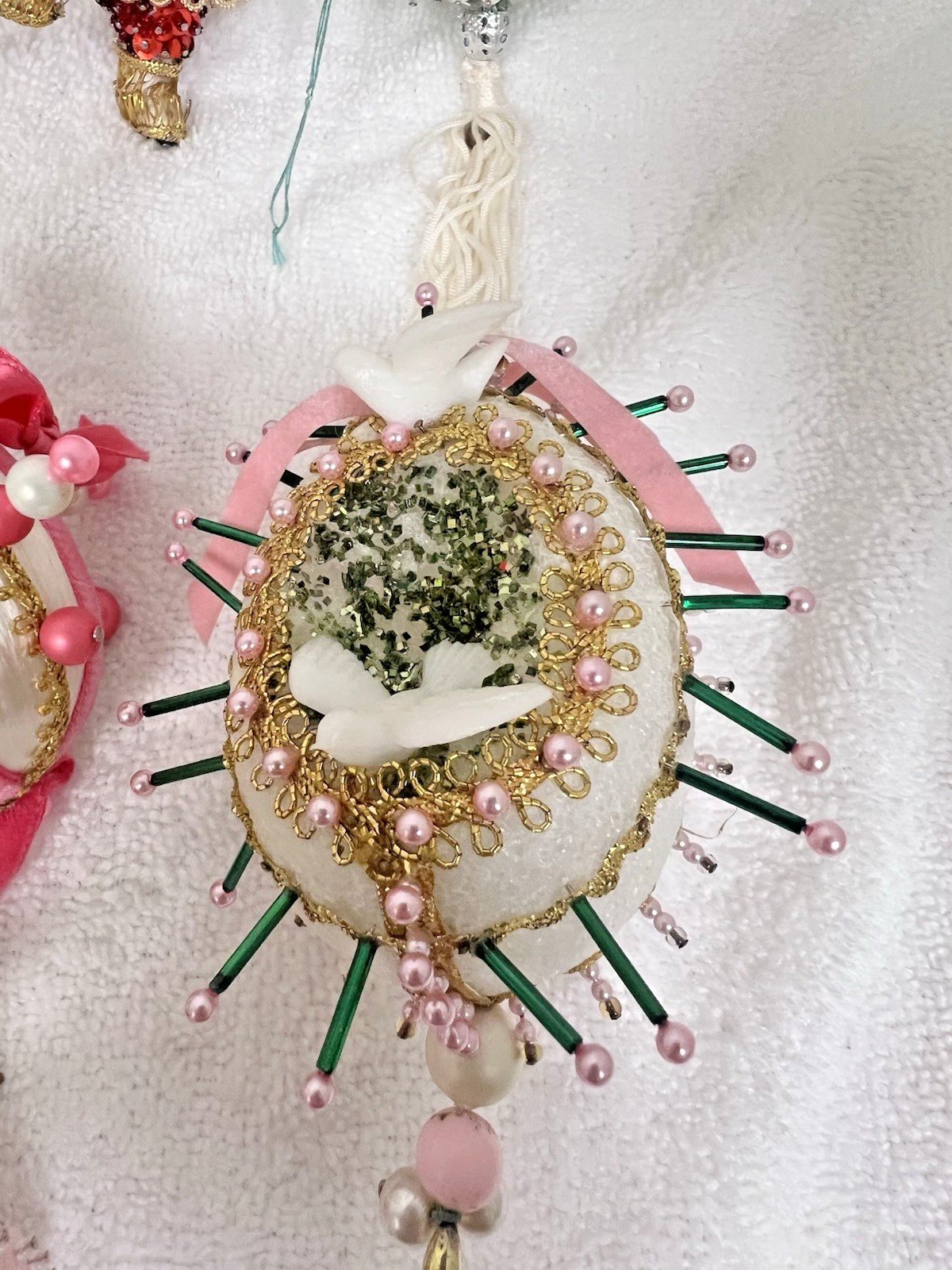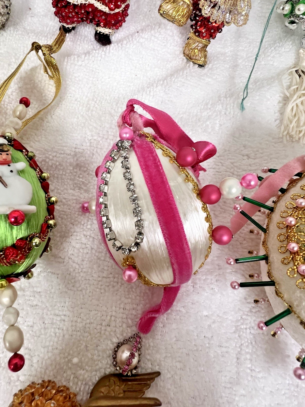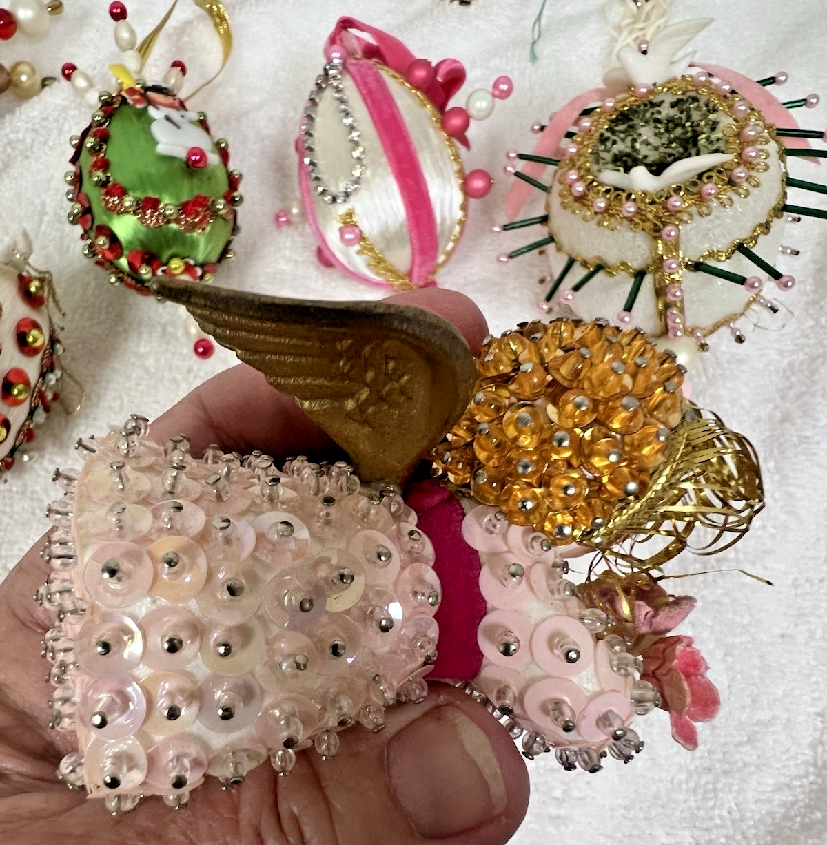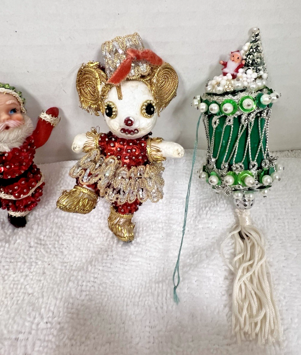 10 VTG Push Pin Beaded Sequin Christmas Ornaments Handmade Snowman Santa Angel + ok so there will be a missing sequin beaded pin here and there but over all these are GREAT. I'm not sure what my favorite is ..dancing mouse the snowman these are fun! I will zip bag each one so if pins come lose you will have all they parts !