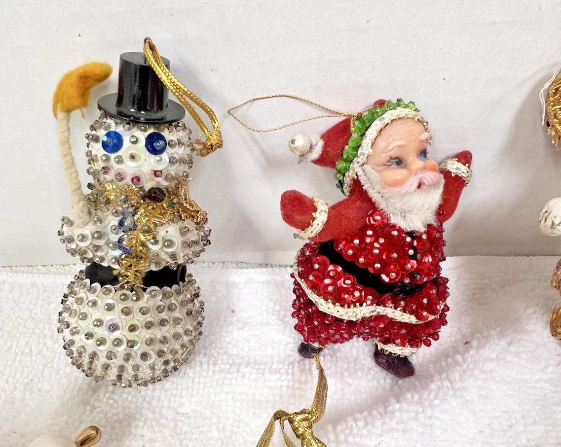 10 VTG Push Pin Beaded Sequin Christmas Ornaments Handmade Snowman Santa Angel +