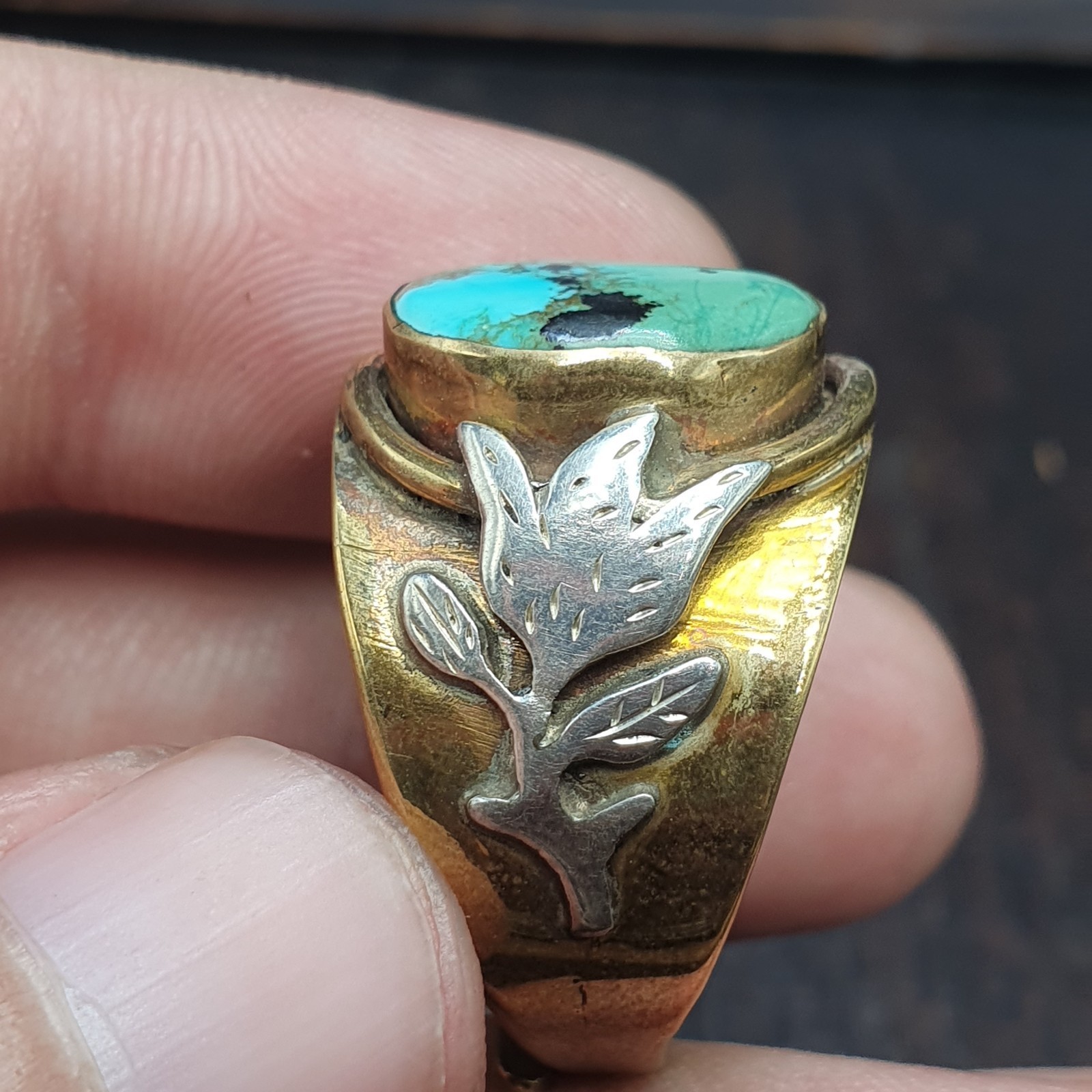 Silver Inlay brass Ring With Arizona Turquoise Center Stone Gold Plated Brass