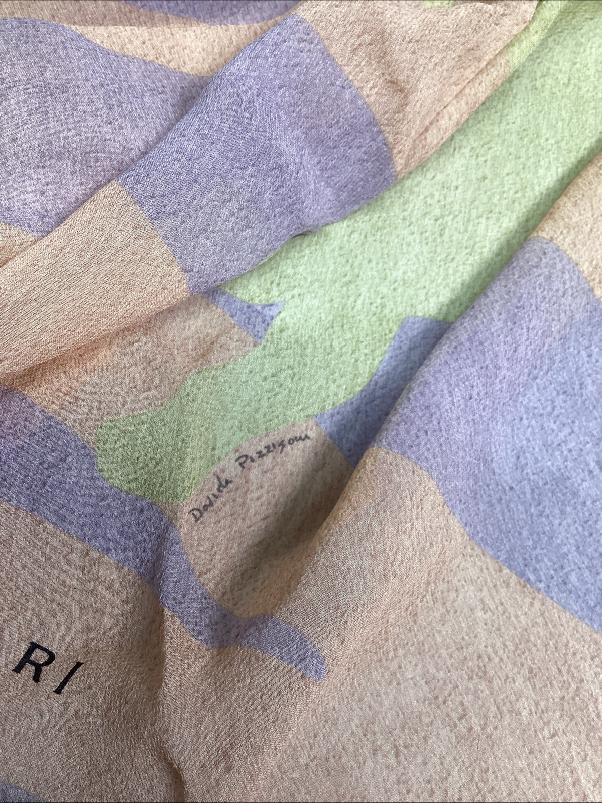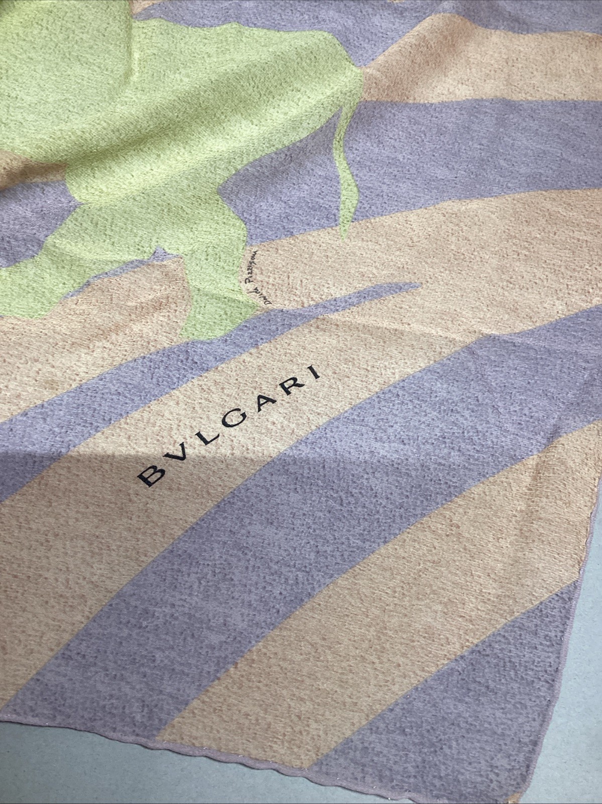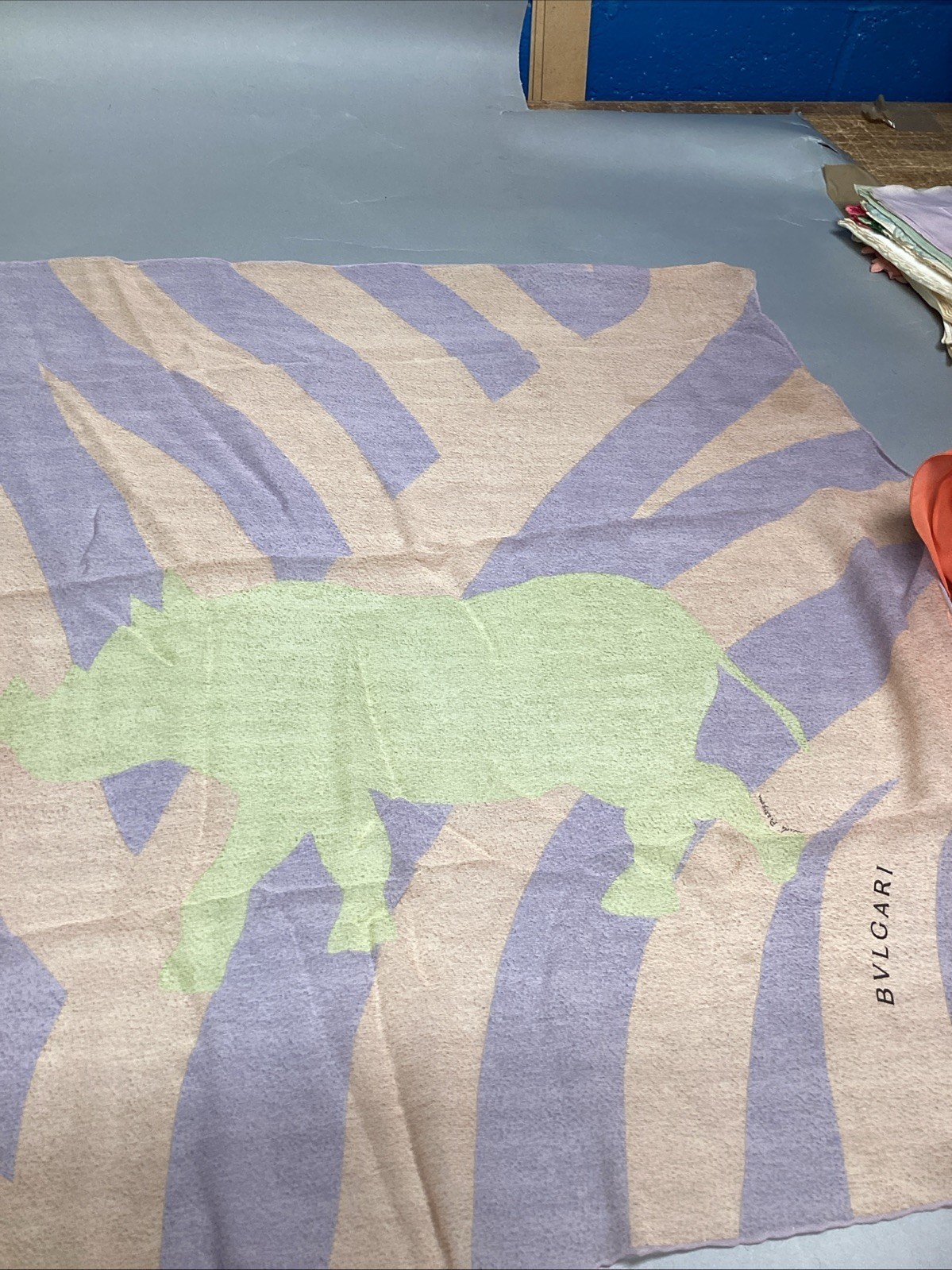 BVLGARI Silk Scarf - Adult And Baby Rhino - 100% Silk - 55x26?. Lightweight. In good condition. Under the baby rhinos one foot, it says David Pizzigou.