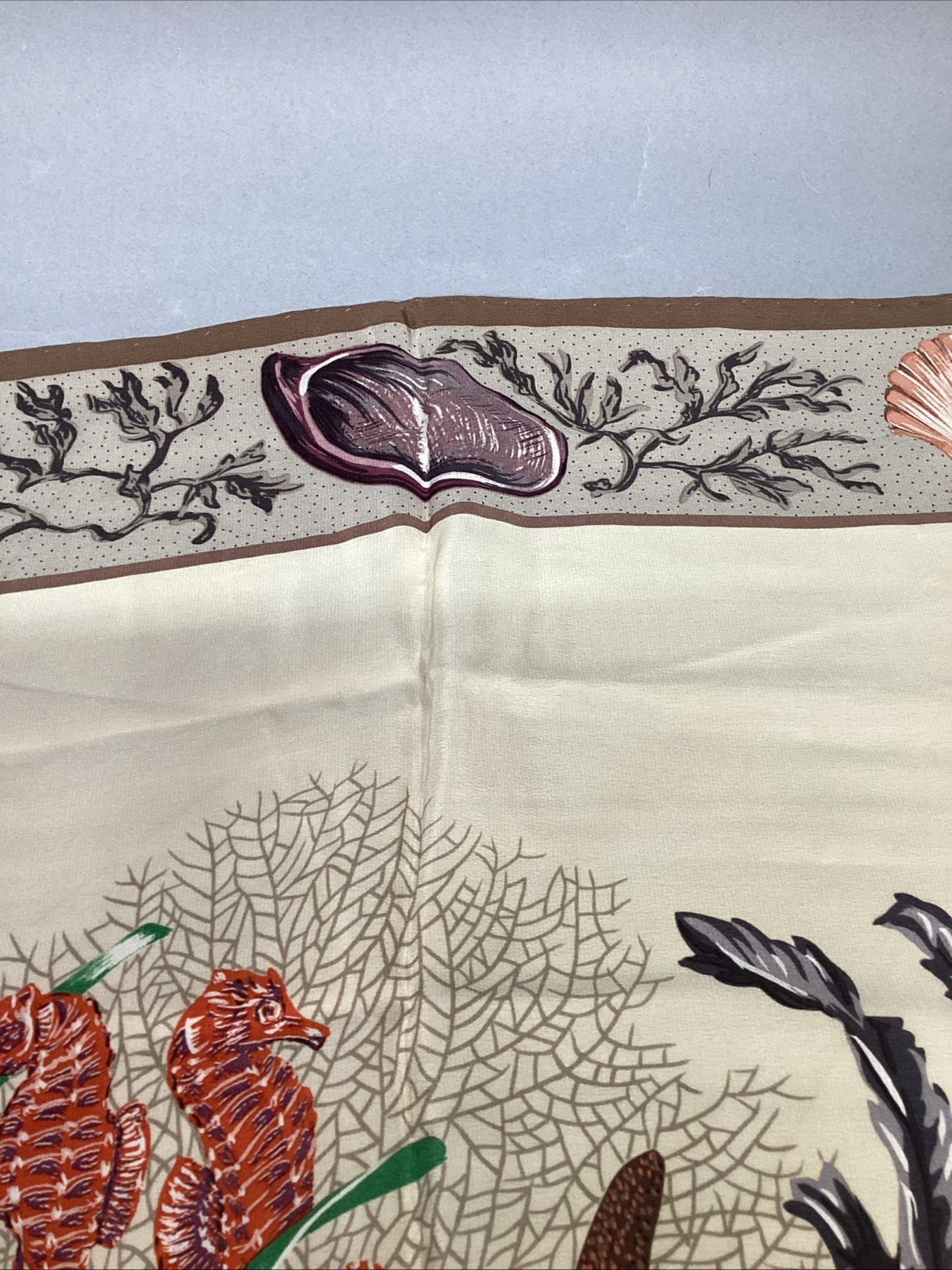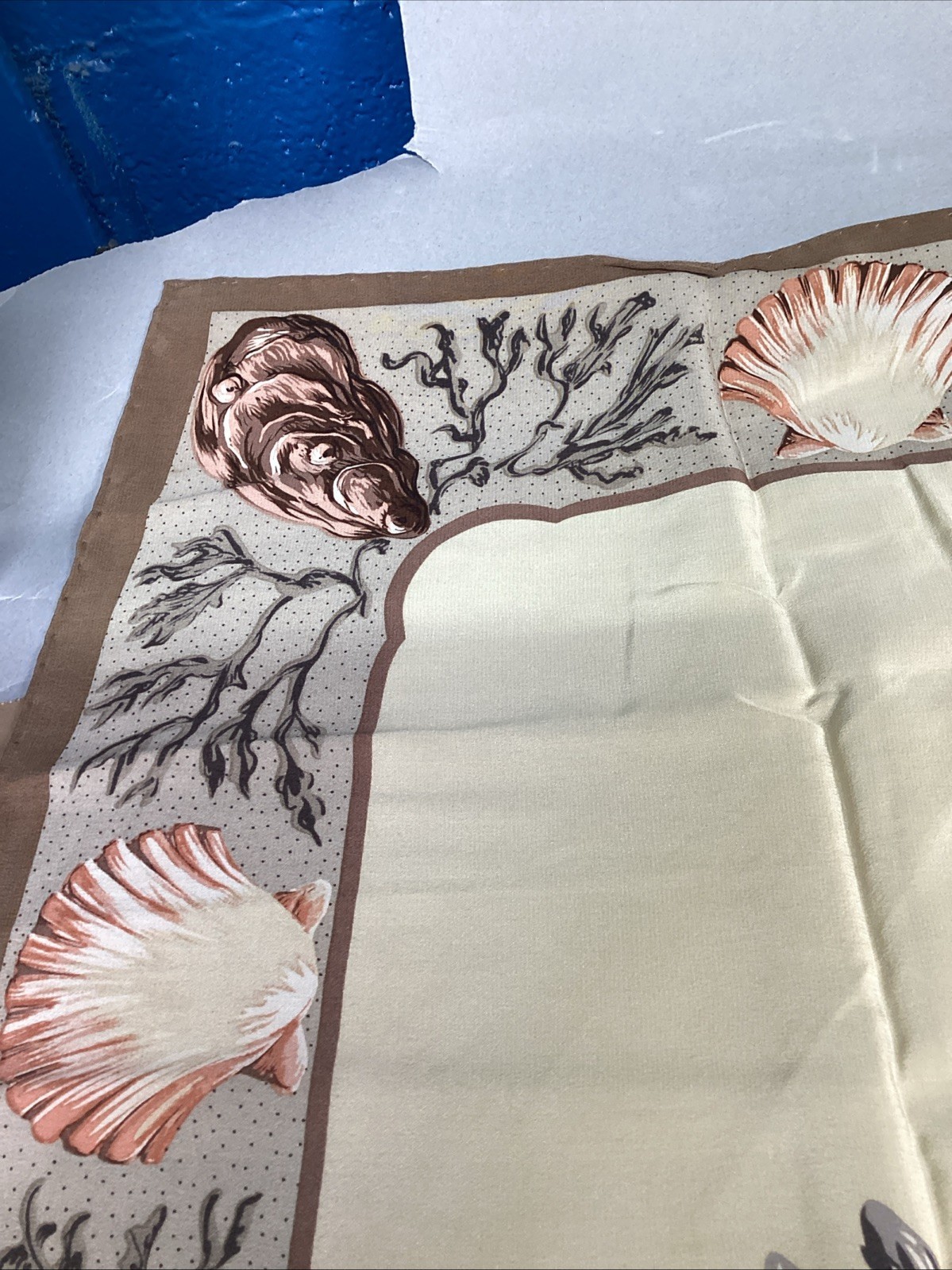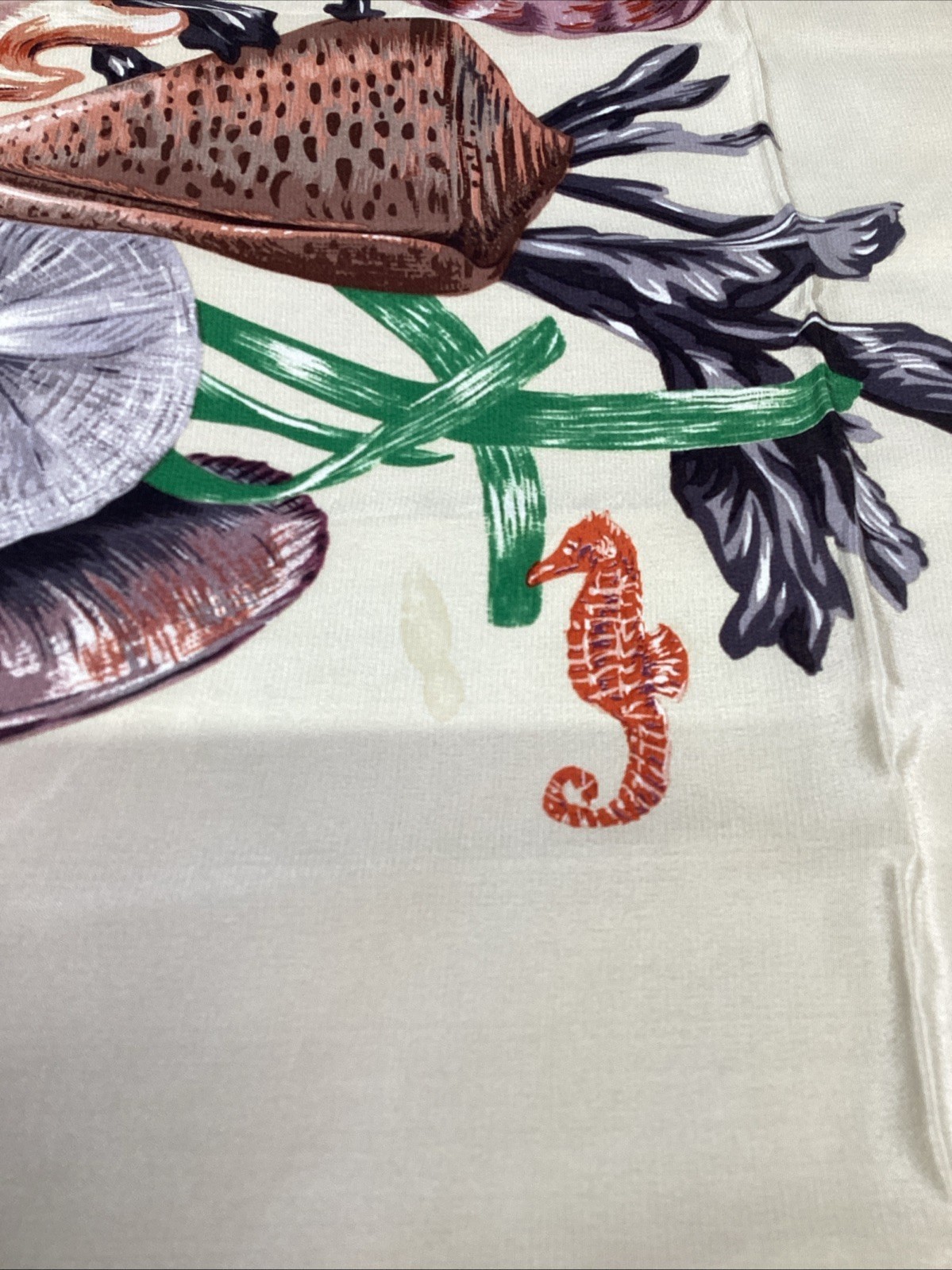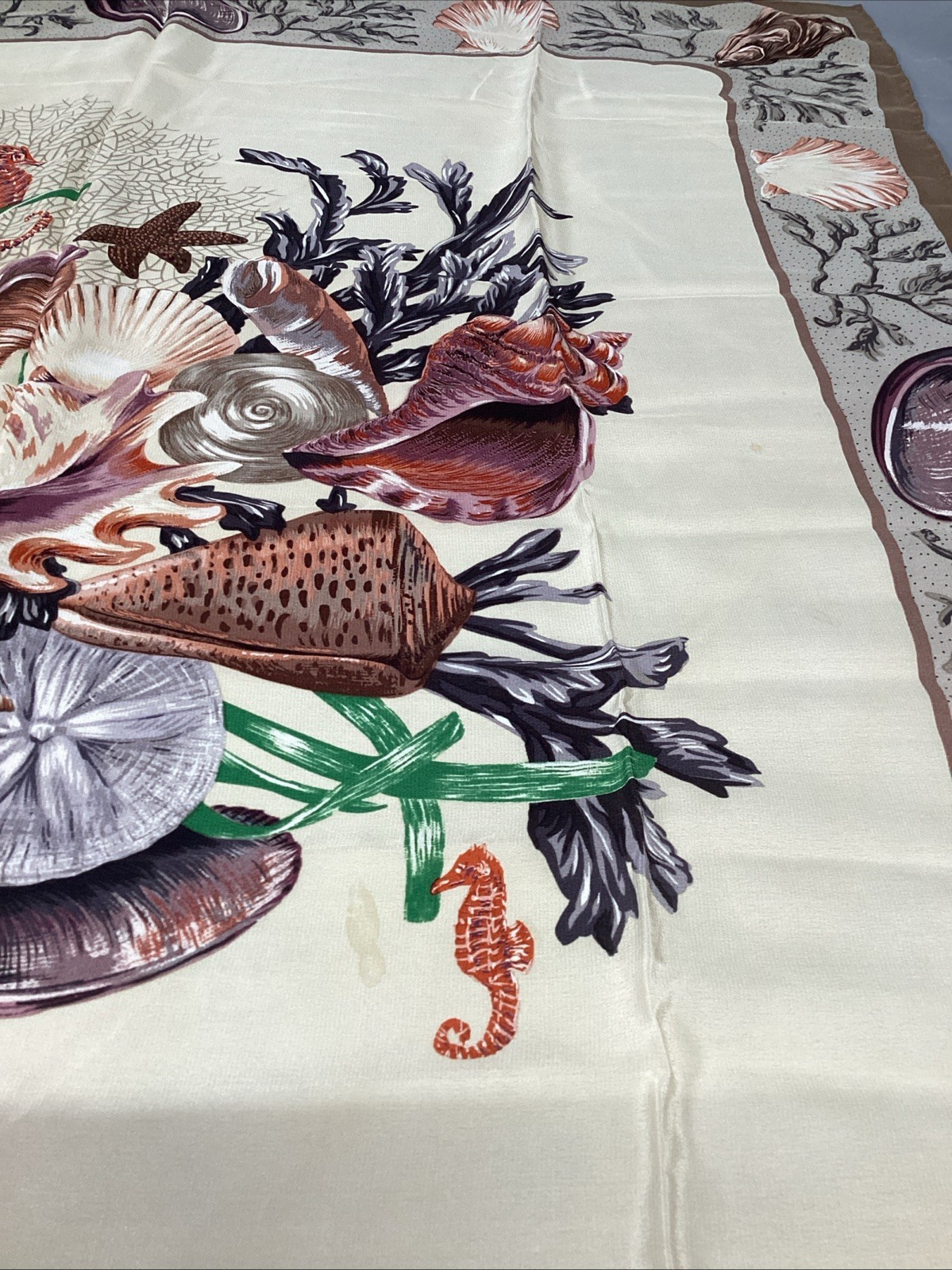 Carlisle 100% Silk Beach Shells Coral Seahorses Scarf - 33x33?. Colors are vibrant and it shows exquisite detail. There are a few stains in the scarf from either normal use or storage. Good condition otherwise.