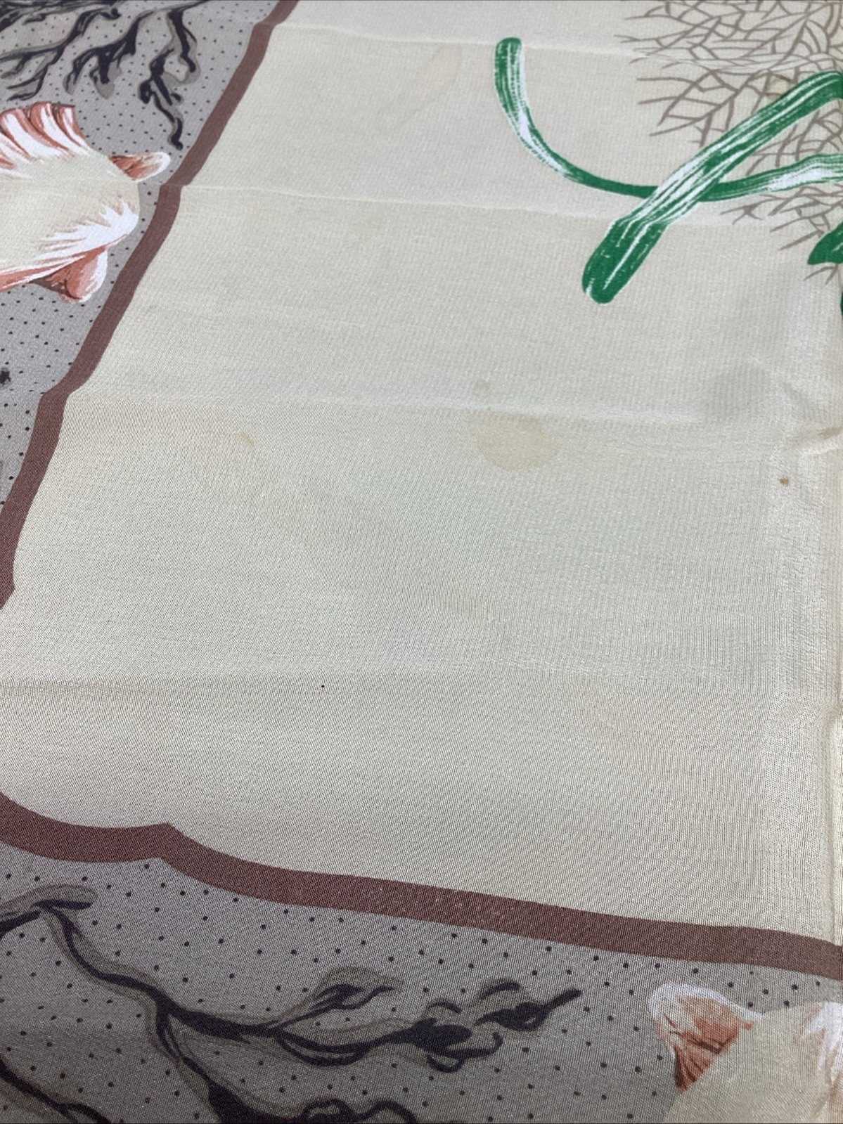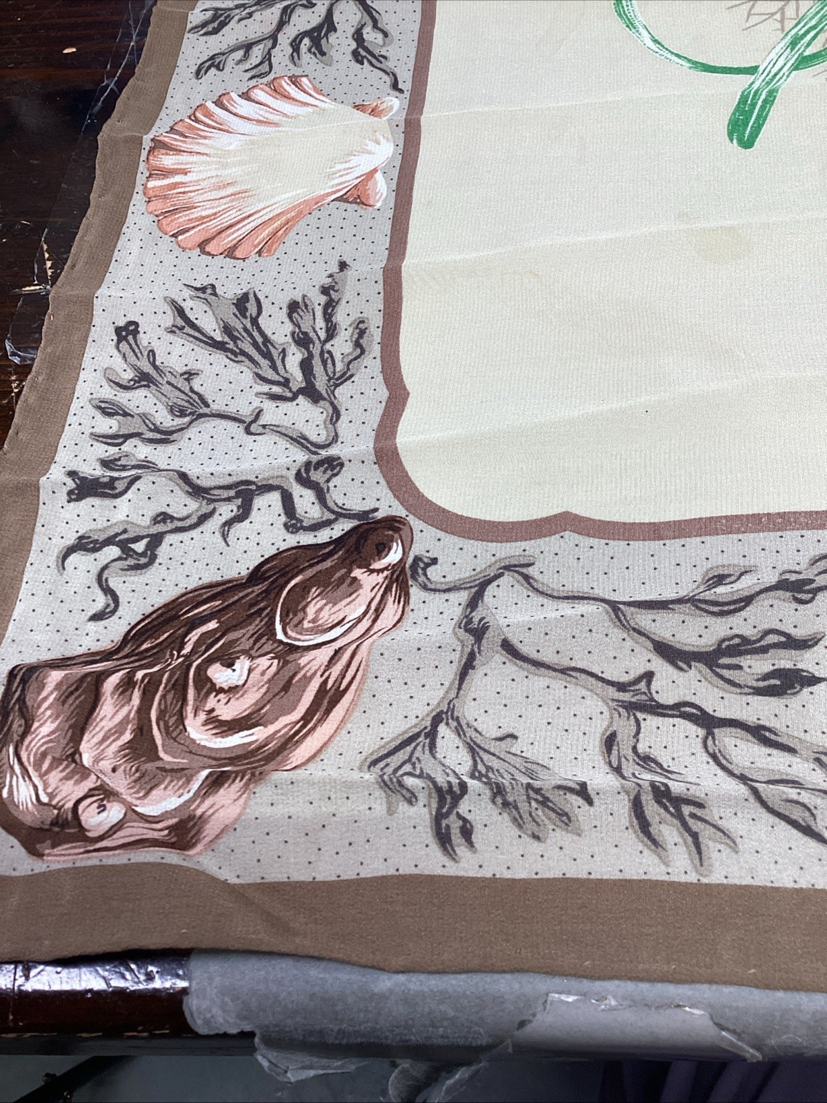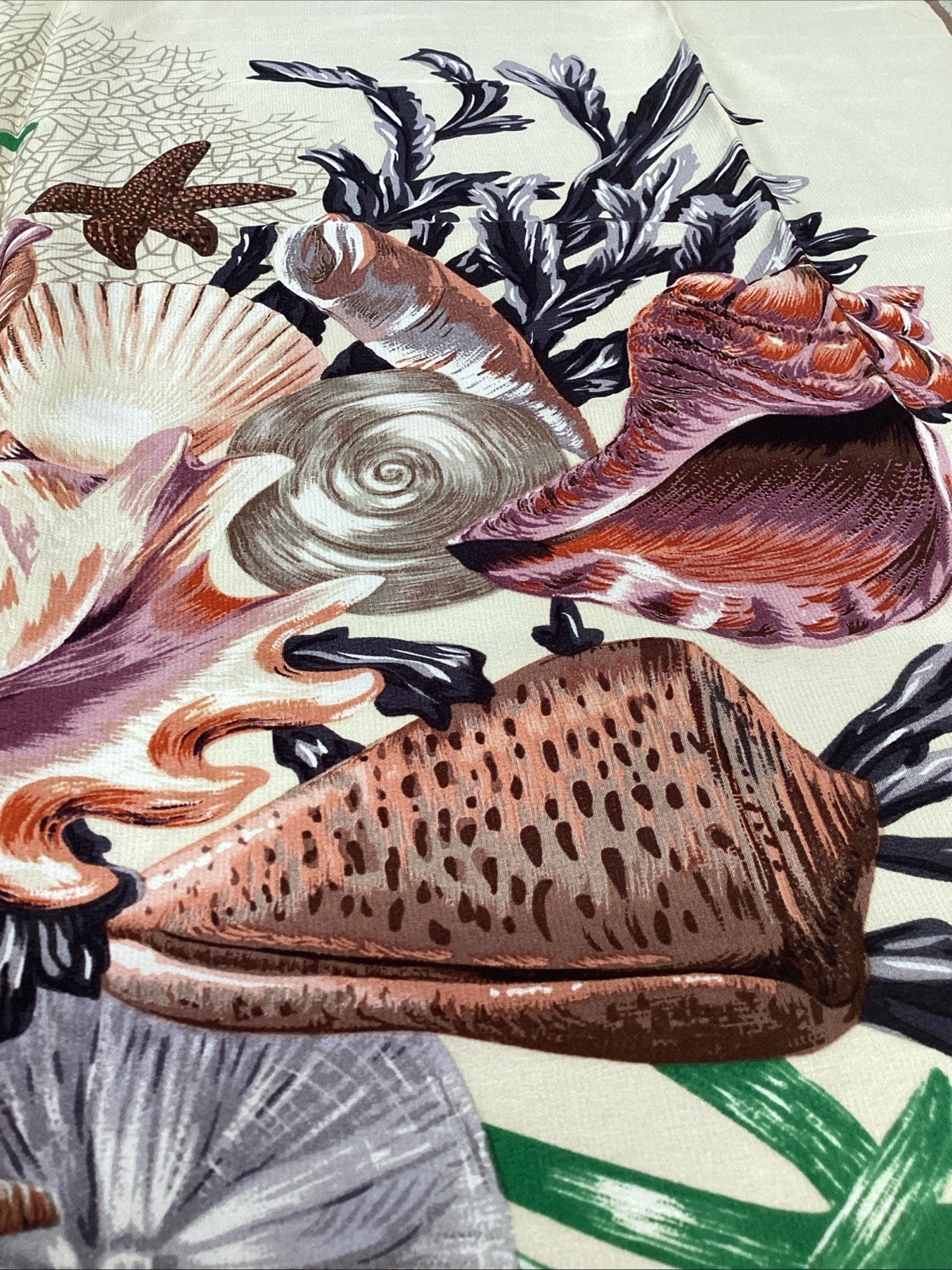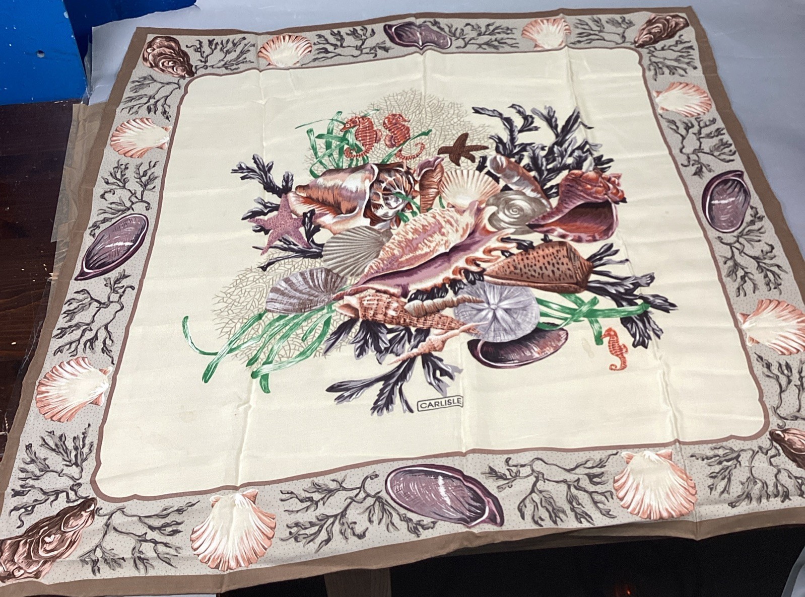 Carlisle 100% Silk Beach Shells Coral Seahorses Scarf - 33x33?. Colors are vibrant and it shows exquisite detail. There are a few stains in the scarf from either normal use or storage. Good condition otherwise.
