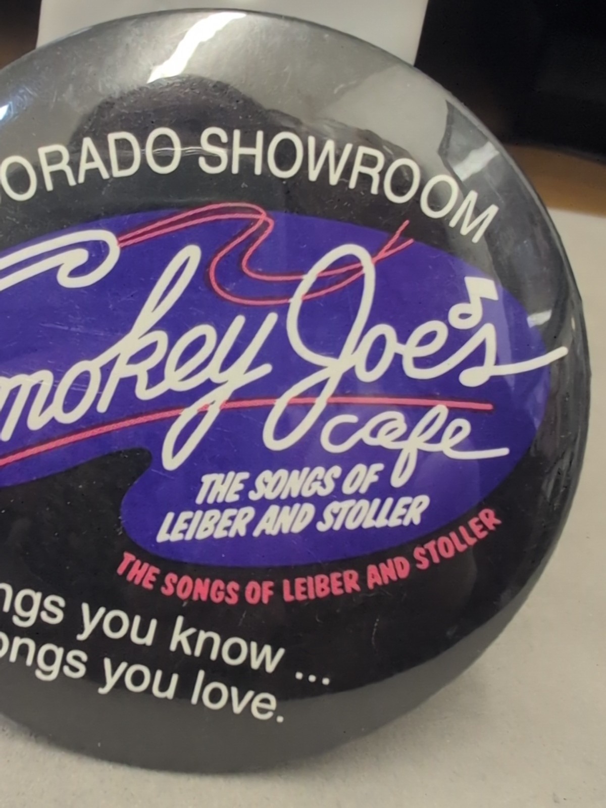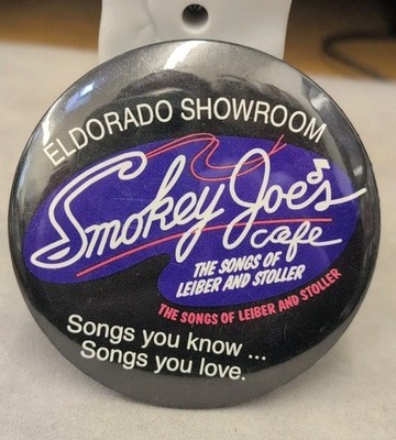 Vintage metal pinback button. El Dorado showroom out of Reno featuring Smokey Joe's Cafe, the songs of Lieber and Stoller. Measures 3" across. No smoke or pet odor.