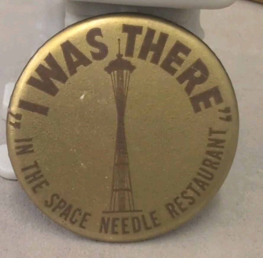 Vintage metal pinback button. Gold tone and brown. I was there in the space Needle restaurant. Seattle Washington. Measures 1.75" across. No smoke or pet odor.