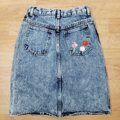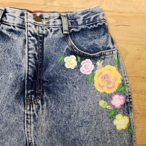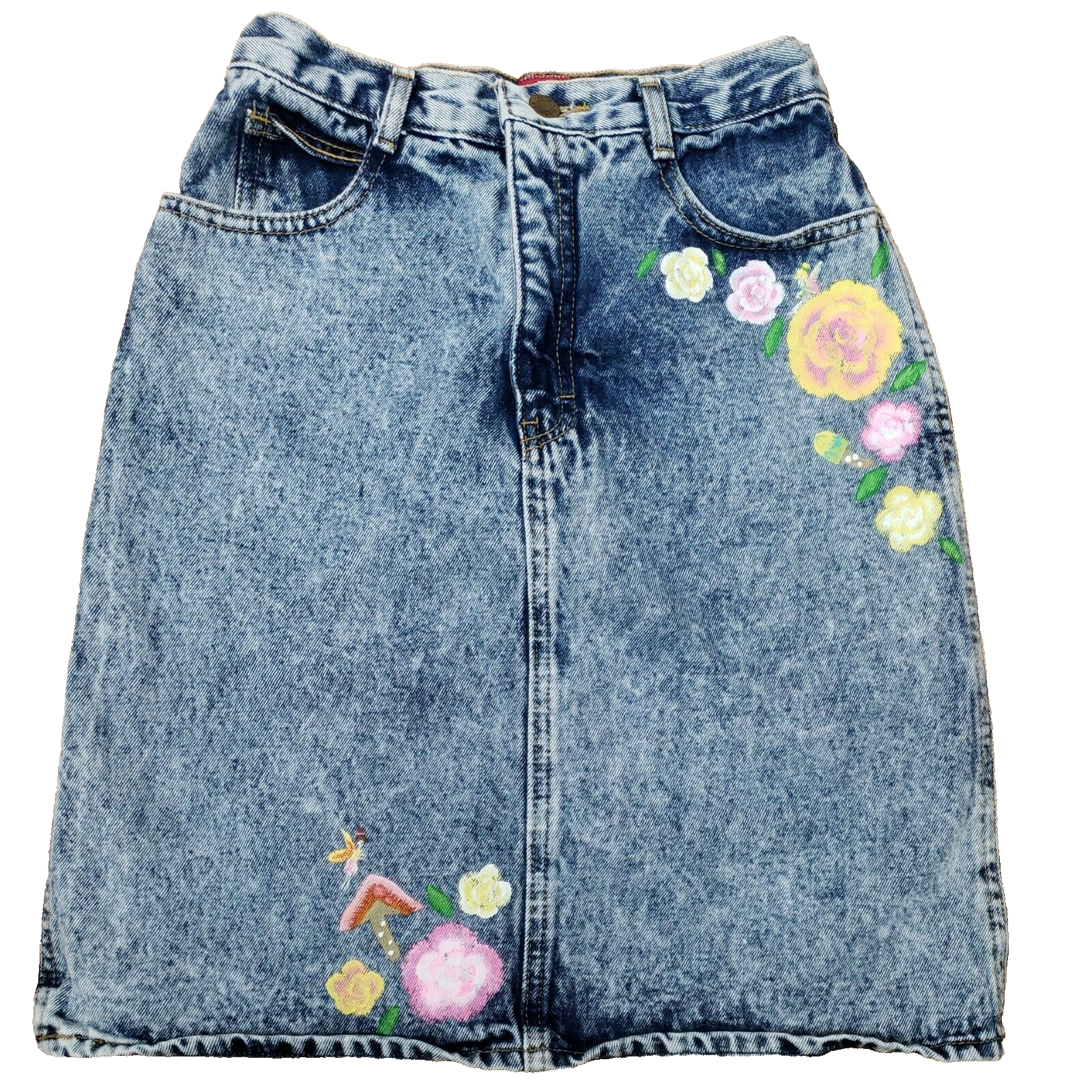 Jack Mulqueen Upcycled Denim Skirt Womens 7 80s Acid Wash Hand Painted Fairies