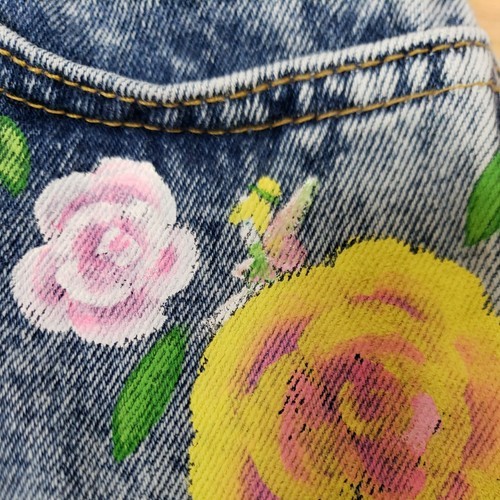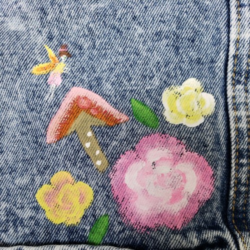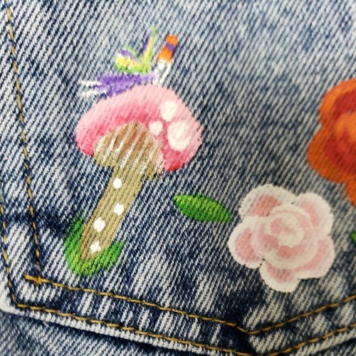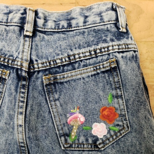 The cutest fairy core mushroom, fairy and floral design along the front hem, back pocket and front hip