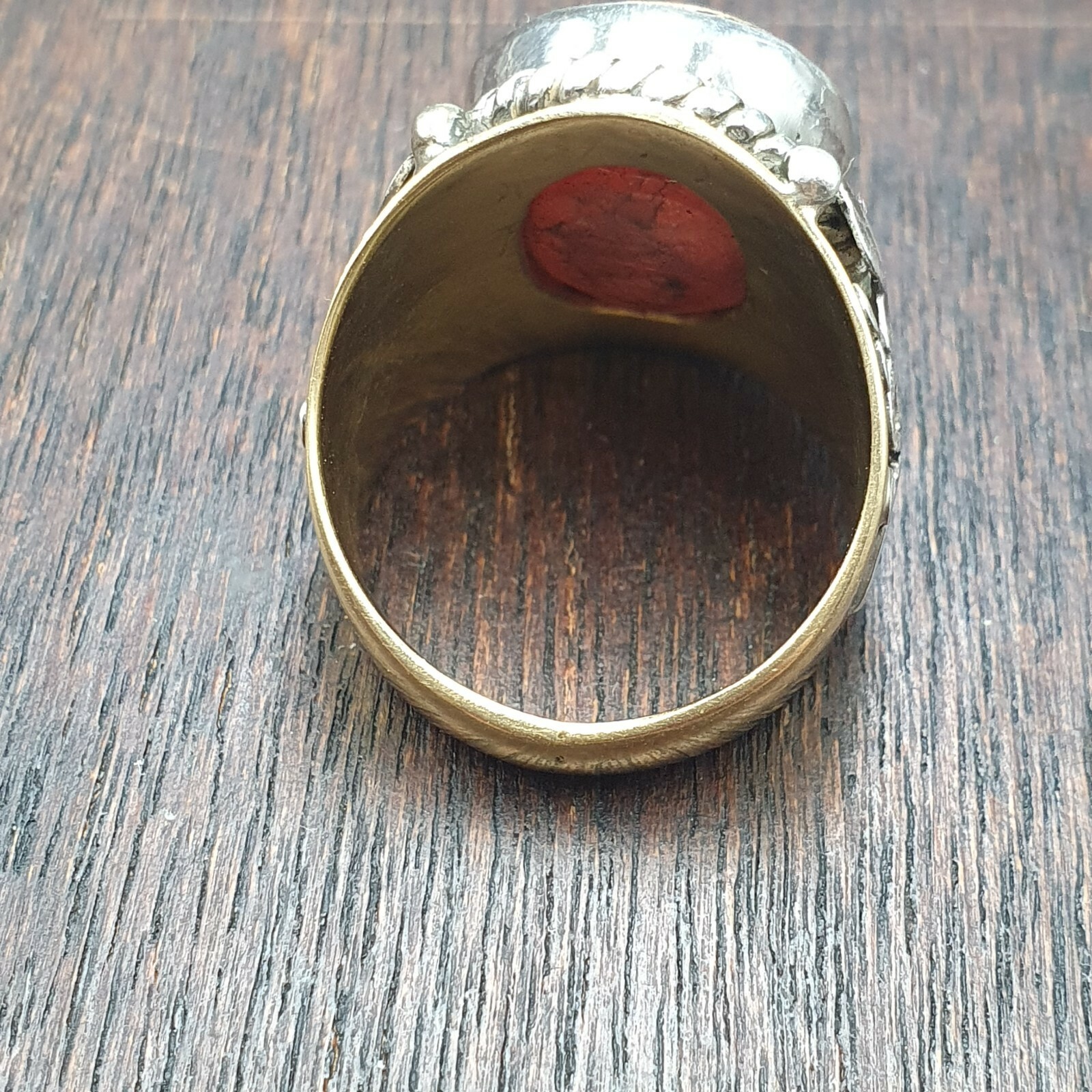 Questo antico anello tibetano presenta una pietra centrale in agata splendidamente incisa con intricato intarsio in argento su ottone. L'anello ha un colore grigio con placcatura in oro, che gli conferisce un aspetto originale vintage. La sua regione di origine e il Tibet, rendendolo un'aggiunta unica a qualsiasi collezione di antiquariato asiatico. Perfetto per chi apprezza la bellezza e l'artigianalita dei gioielli antichi, questo anello e un must-have per collezionisti e appassionati. Non perdere l'opportunita di possedere un pezzo di storia.