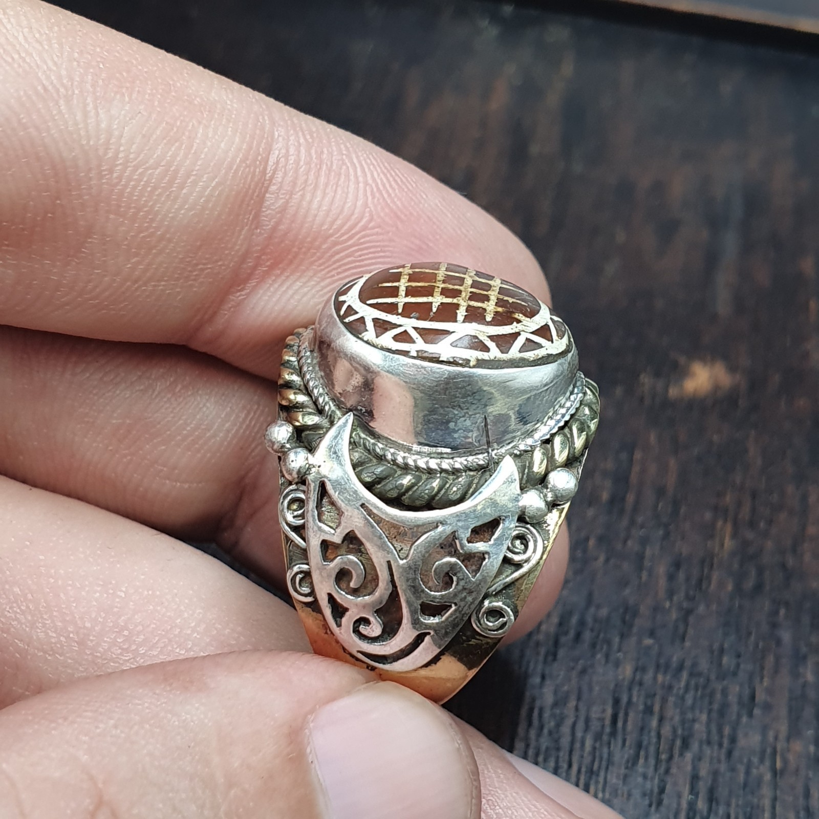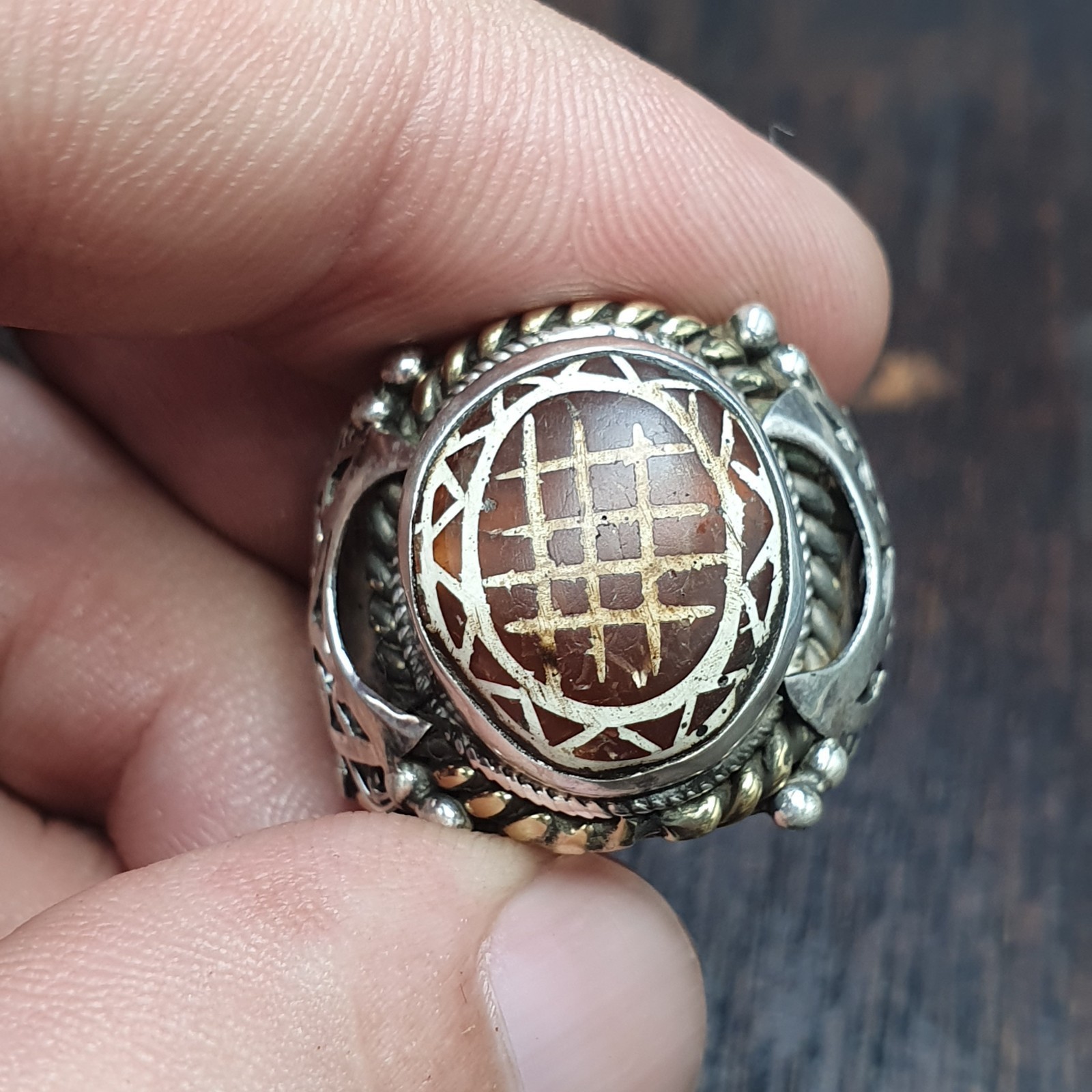 Antiker tibetischer Ring aus geätztem Achat Karneol Stein Silber Intarsien...