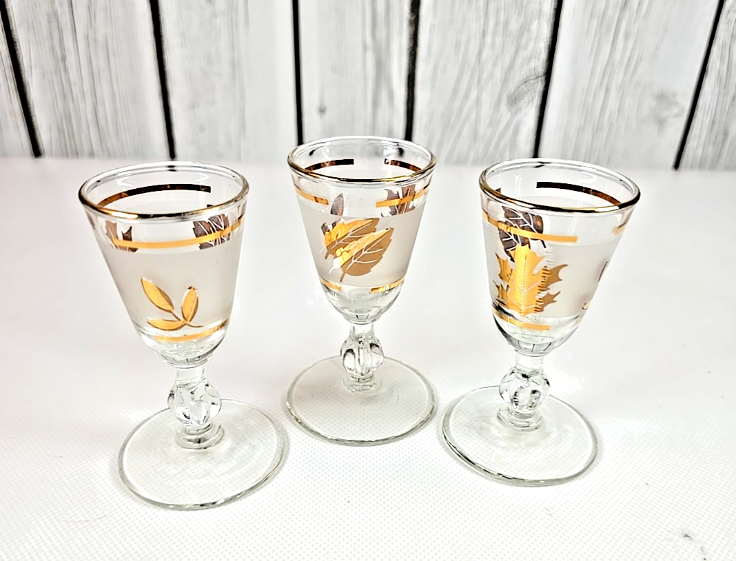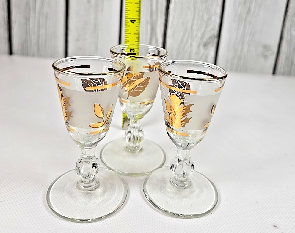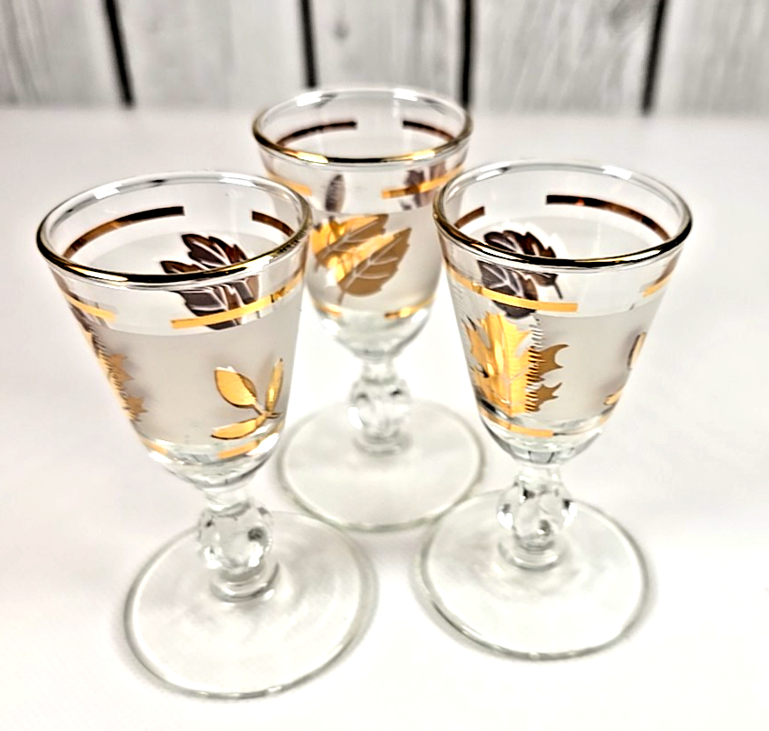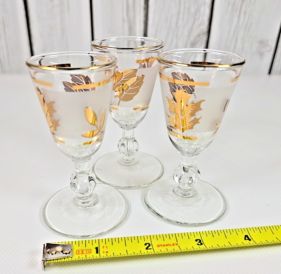3 VTG Libbey Golden Foliage Cordial Shot Glasses 1 oz 1960s MCM Gold Leaves