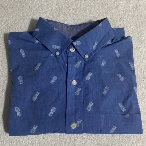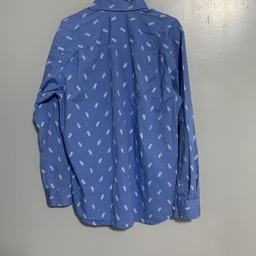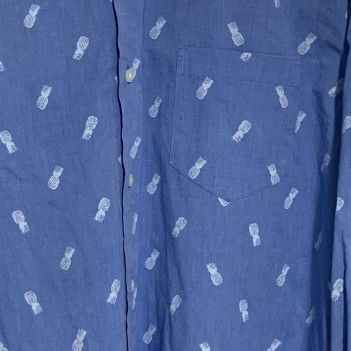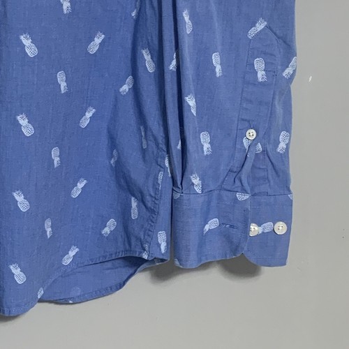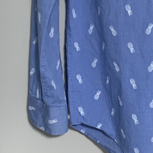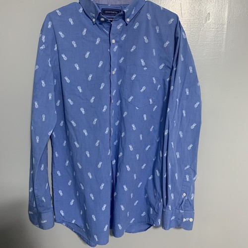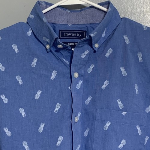 This classic fit Crown Ivy shirt in size M features a fun blue pineapple print perfect for any casual occasion. The long sleeve button-up shirt is made of high-quality materials and is designed for regular size type. The shirt is ideal for men who want to add a touch of style to their wardrobe. The blue color is vibrant and eye-catching, making it a great addition to any outfit. The shirt is pre-owned but is still in excellent condition, ready to be worn and enjoyed.