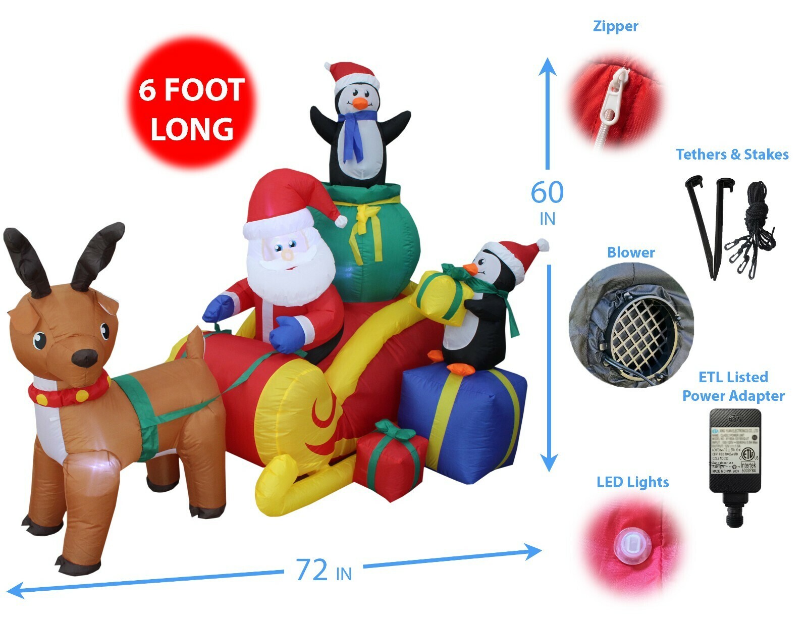 6 Foot Long Christmas Inflatable Santa Reindeer Moose Penguin Sleigh Decoration
