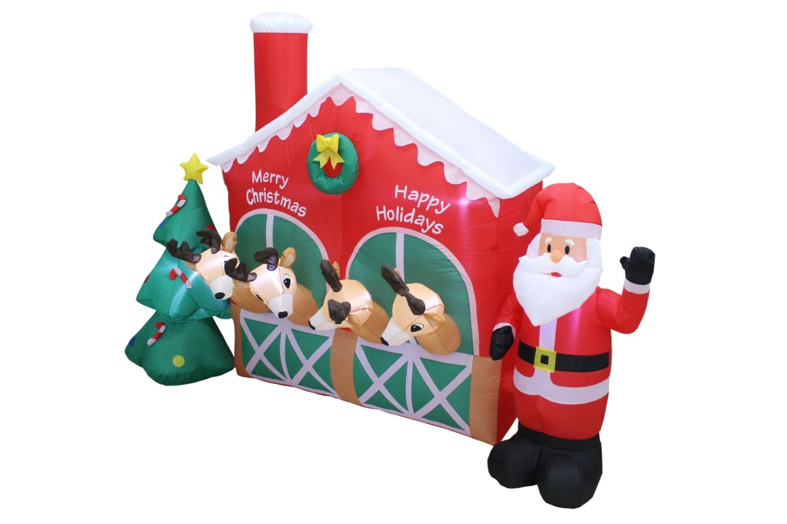 9 Foot Long Christmas Inflatable Santa Claus Reindeer in Stable with Christmas Tree Yard Decoration