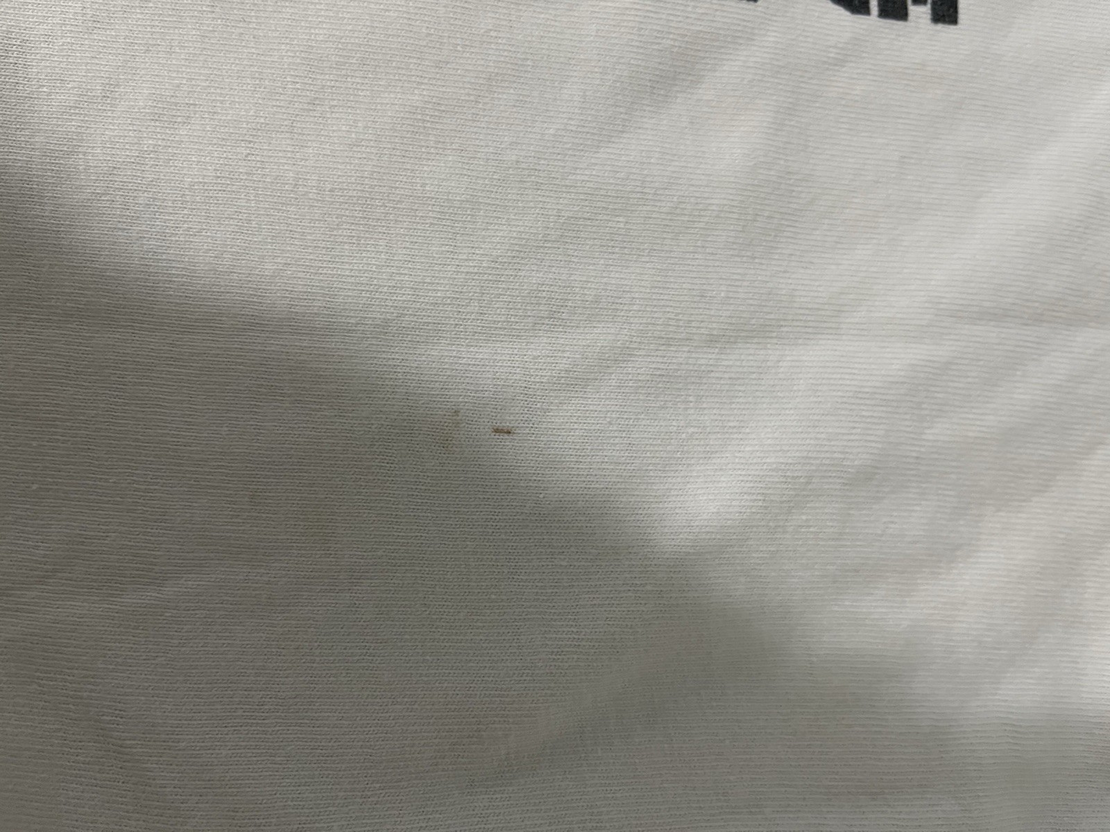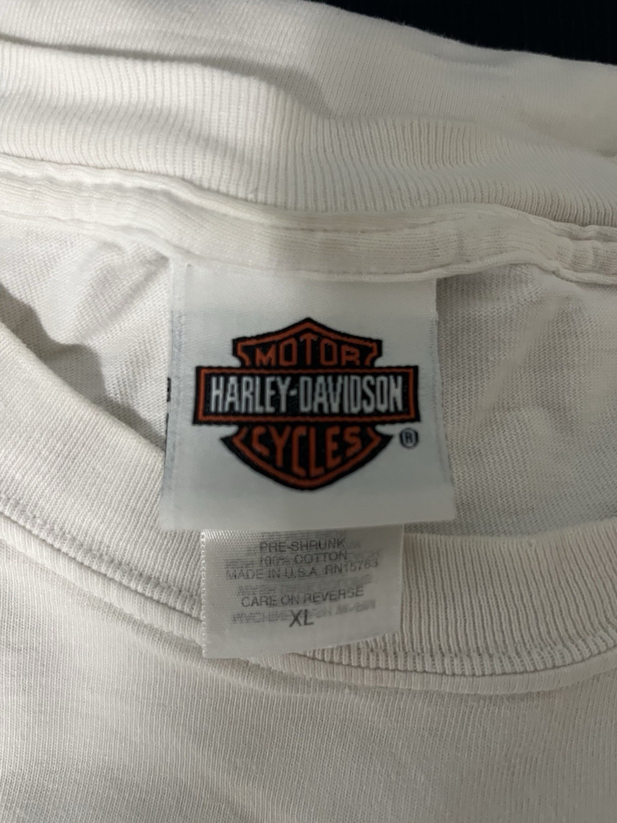 The Y2K 2002 Harley T Shirt from Sioux City, Iowa is a vintage piece featuring the iconic Harley-Davidson logo. Made of cotton with a crew neck and short sleeves, this white t-shirt is machine washable and fits in XL size. The shirt is perfect for all seasons and can be worn by both men and women who appreciate the motorcycle and biker theme. With a classic design and the Hanes Beefy-T product line, this t-shirt is a must-have for Harley enthusiasts looking to add a piece of biker history to their wardrobe. Has small hole on back near neckline and a few small hard to see spots on front?see photos
