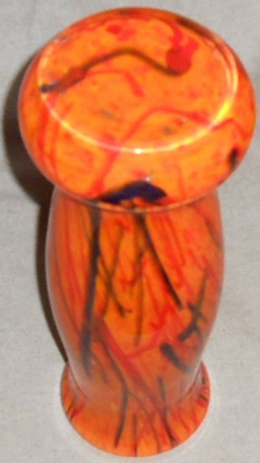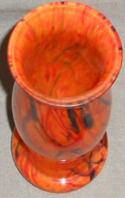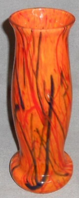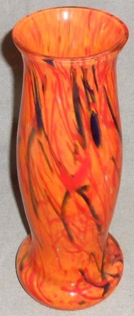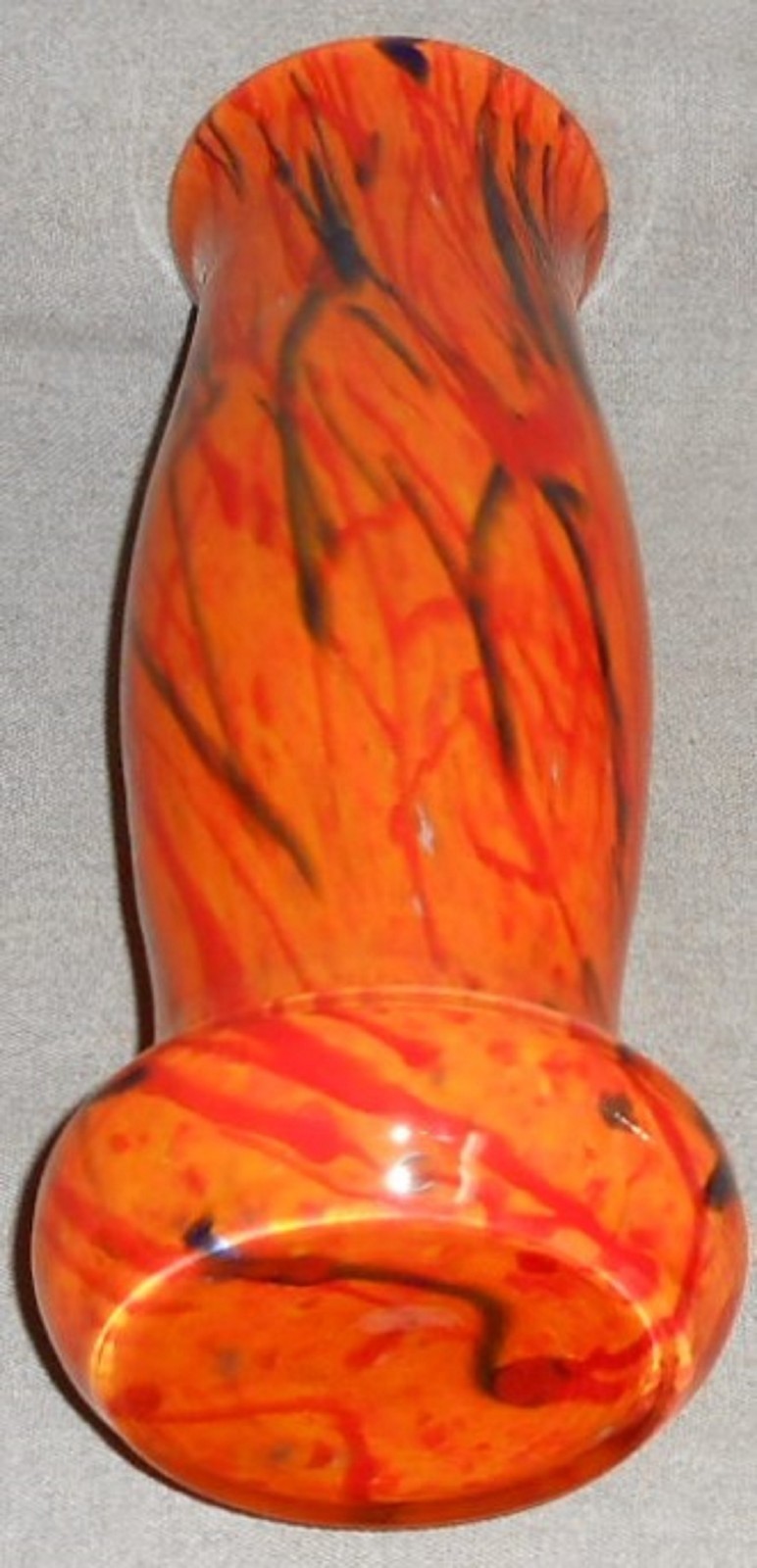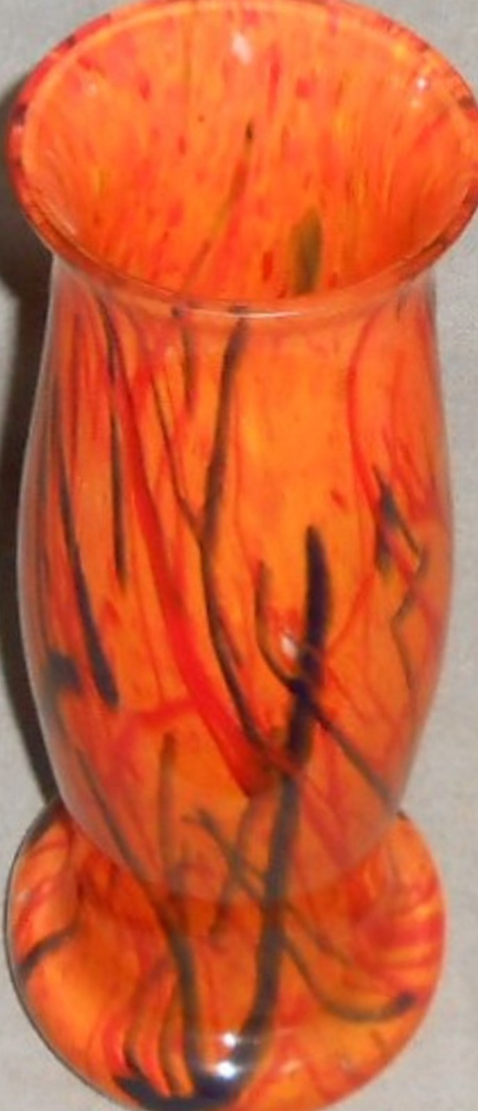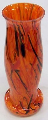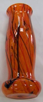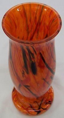 This is a beautiful Art Deco Glass Vase circa 1930s from Czechoslovakia that has the mottled colors. It measures approx 11 3/4" tall and the predominate colors include black, orange and red and the vase is in good antique pre-owned condition but has a few very minor chips and rough spots along inner rim...no other flaws or damage!