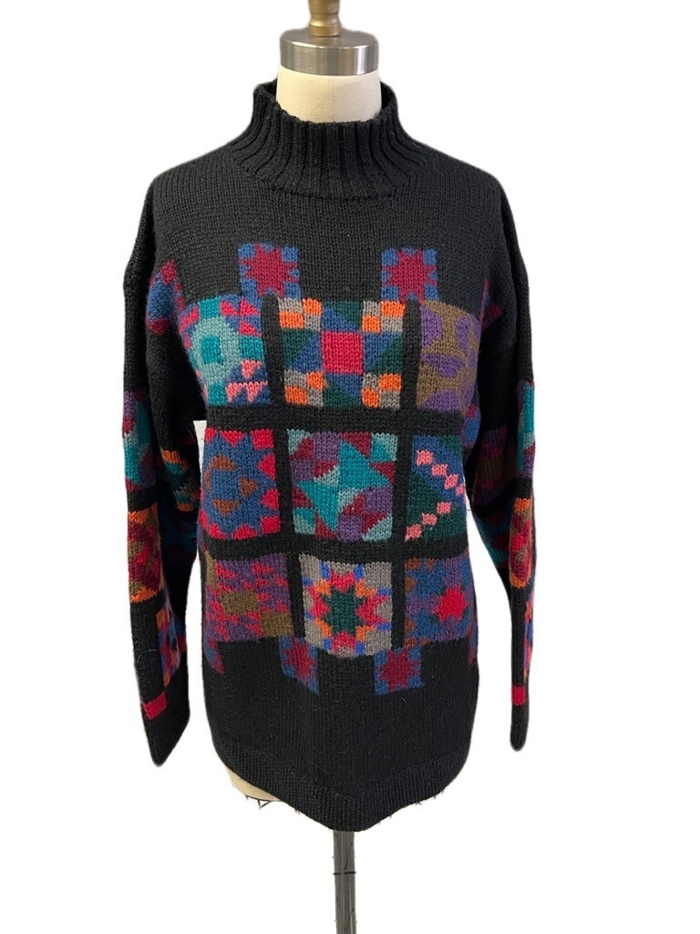 VTG 80s LL Bean Wool Sweater M Black Colorful Quilt Block Folk Art Boho Cozy