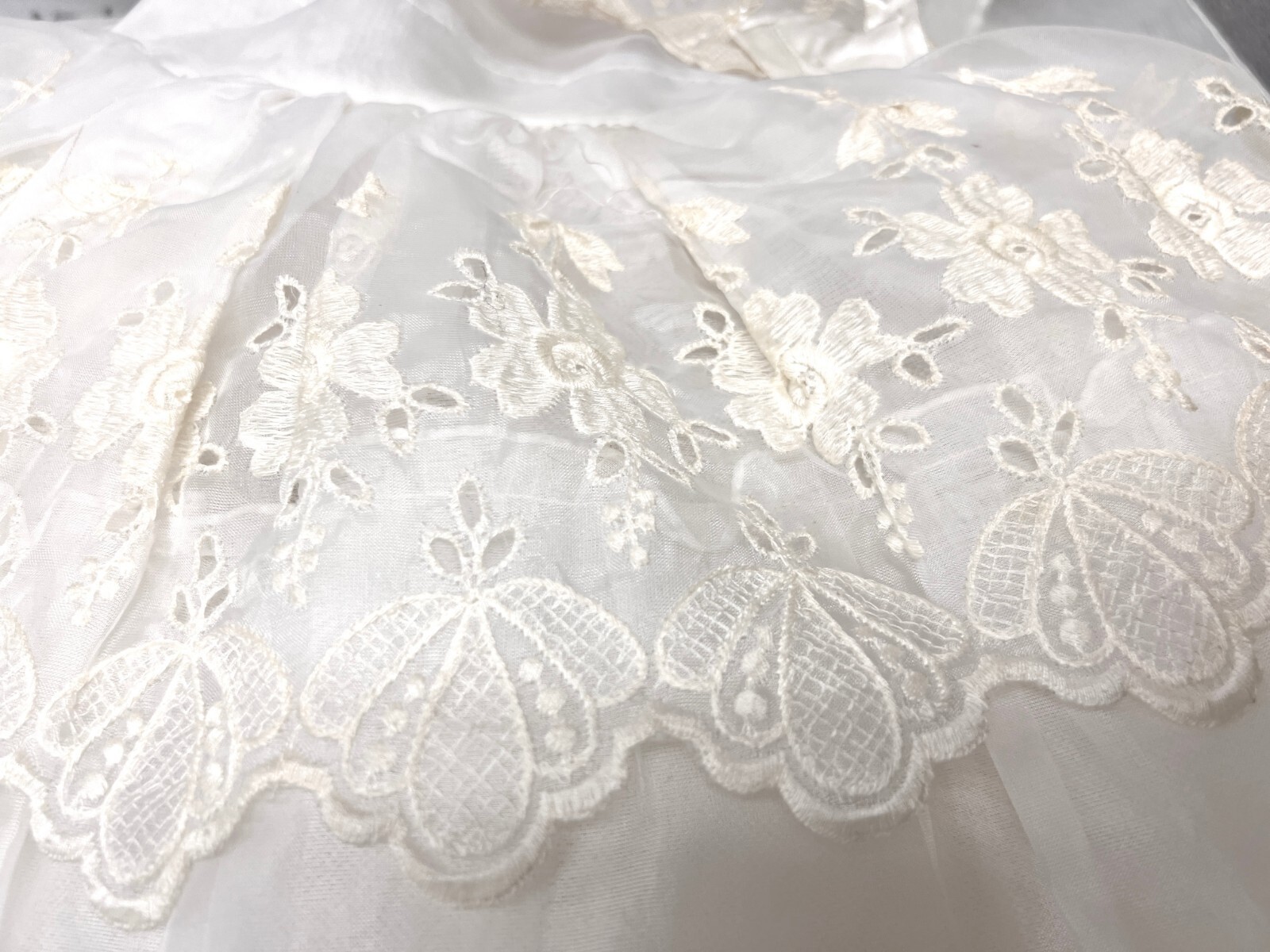 Excellent vintage condition ? clean and odor-free, no rips or stains. Embroidered trim has yellowed to ivory with age, but the piece is otherwise near unworn, with the slip showing its original paper size tag.