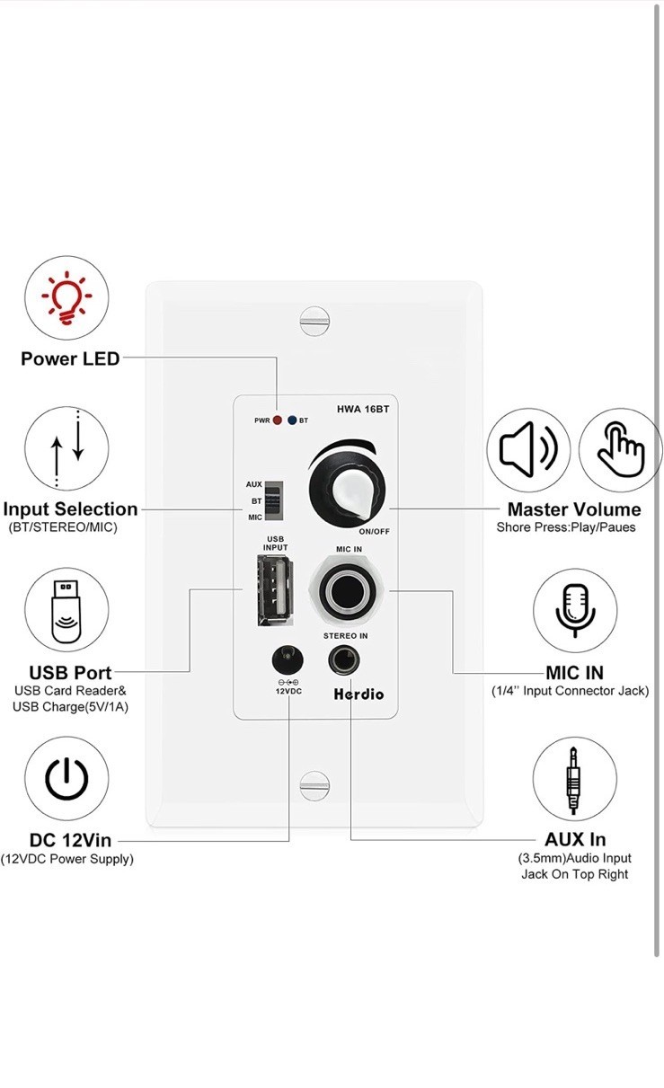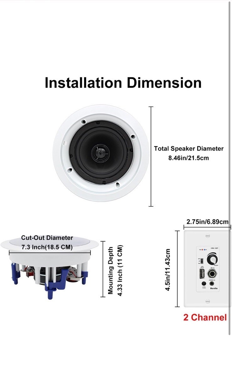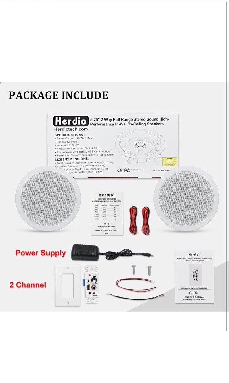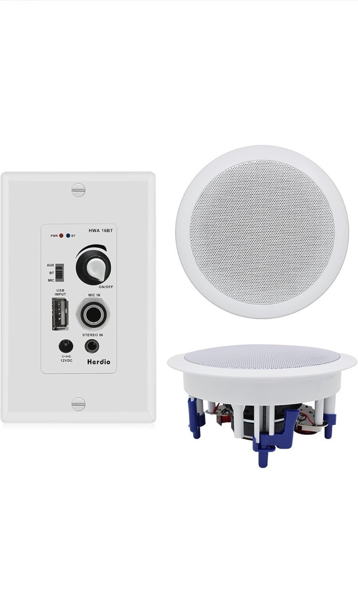 The Herdio 5.25? 2-Way Full Range 300watt Amp with Wall Control offers deep bass sound for an immersive audio experience. With Bluetooth connectivity, microphone input, and USB compatibility, these ceiling/wall speakers provide versatility in how you enjoy your music. The white round design and 150x2 RMS power ensure a sleek and powerful addition to your home audio setup. Each unit quantity includes two speakers, making it easy to create a surround sound system throughout your living space. Enjoy great sound quality with the Herdio brand's reputation for delivering exceptional audio performance.