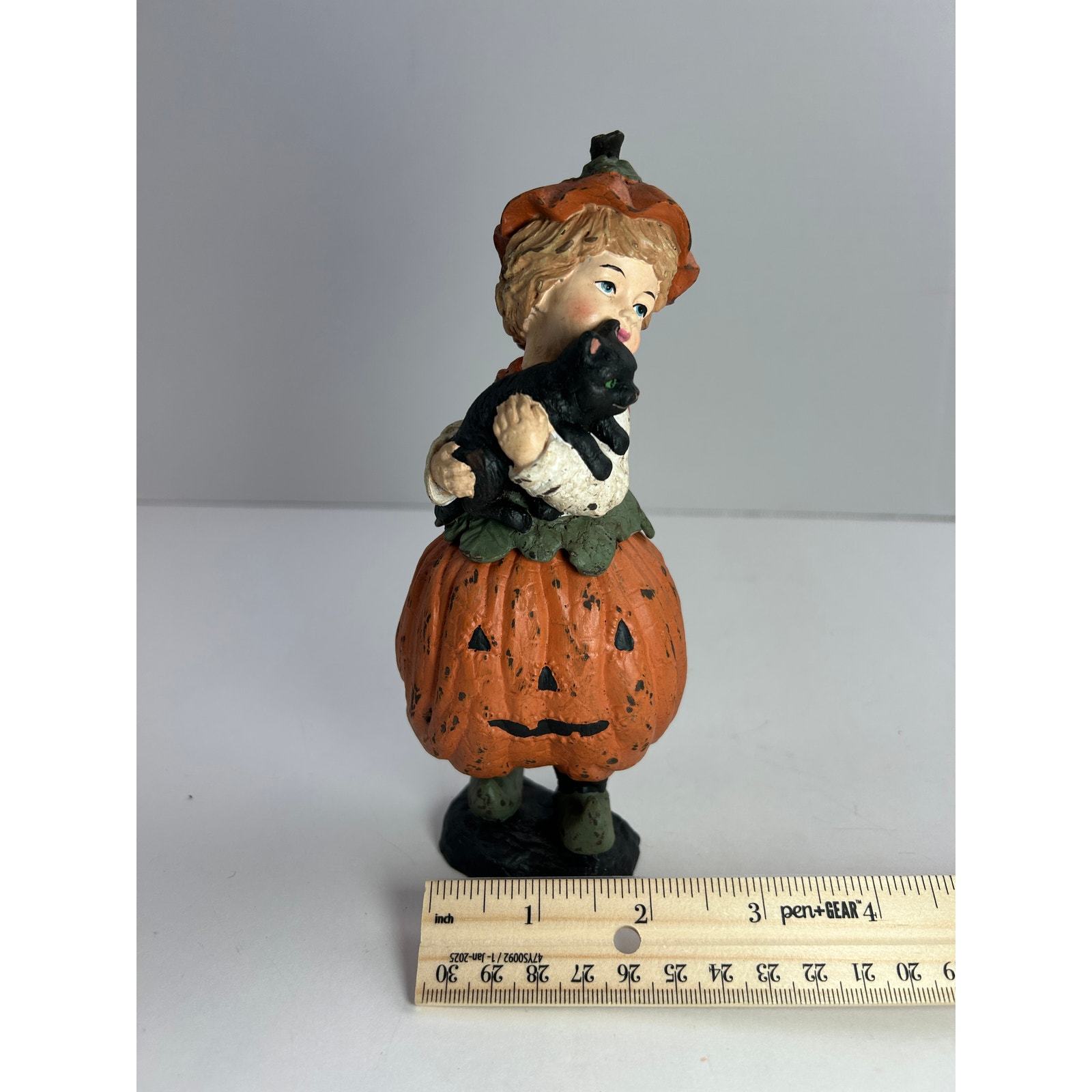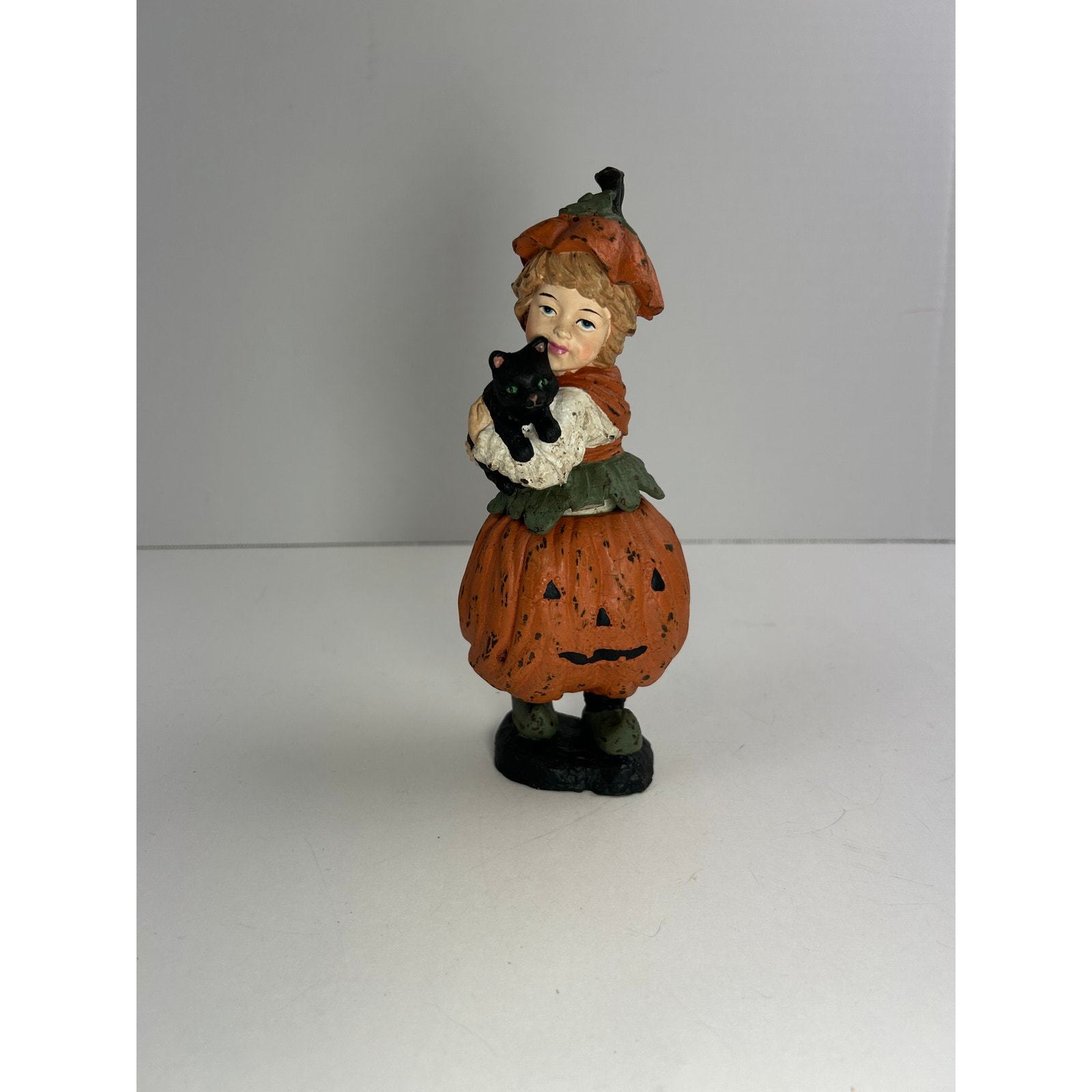 Bethany Lowe ?Paige in Pumpkin? candy container figurine featuring a child emerging from a jack-o-lantern body holding a cat. The pumpkin shell is hollow and usable as a candy dish or decorative container. Made by Bethany Lowe Designs (label visible).