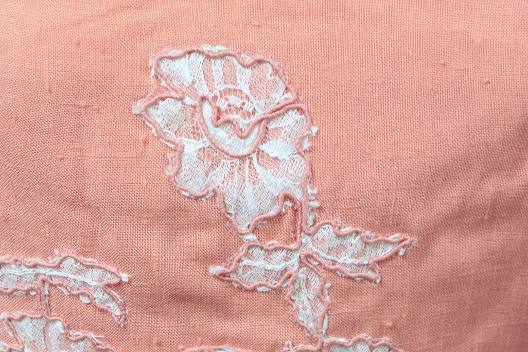 VTG 50s Harou’ Coral Linen Wiggle Dress M Lace Applique Pencil Pinup Bombshell
