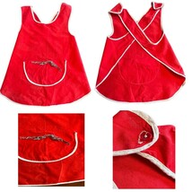 Antique 1930s?40s child?s pinafore apron, toddler size 18M?2T (chest 23?, length 15?), crafted in bright red cotton with crisp white piping. Features a criss-cross strap back with red celluloid buttons, a pocket trimmed in plaid with a bow, and a short pinafore silhouette. A darling piece of children?s fashion history, equally suited for doll or display.