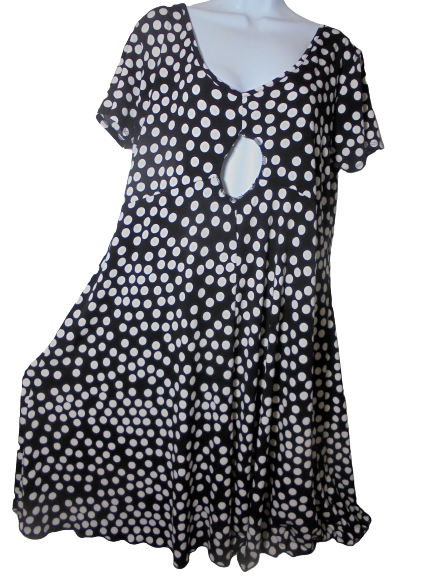 Description: Pretty dress with big bold floral print. Stretchy knit. Short flutter sleeves. V-neck and circle bodice. Fitted waist, flared skirt. Pullover. Bold polka dot print. Flowy, swirly skirt.