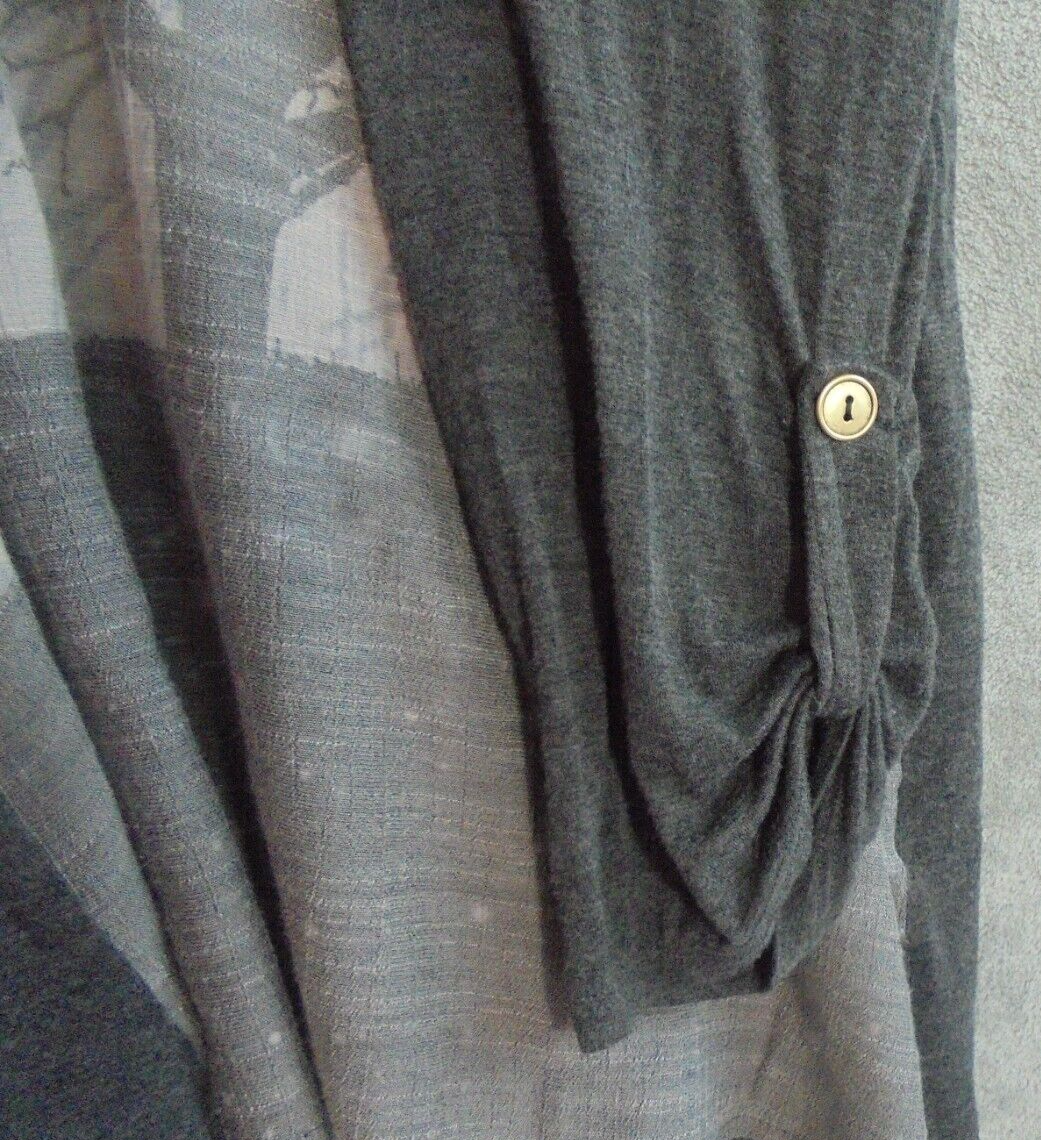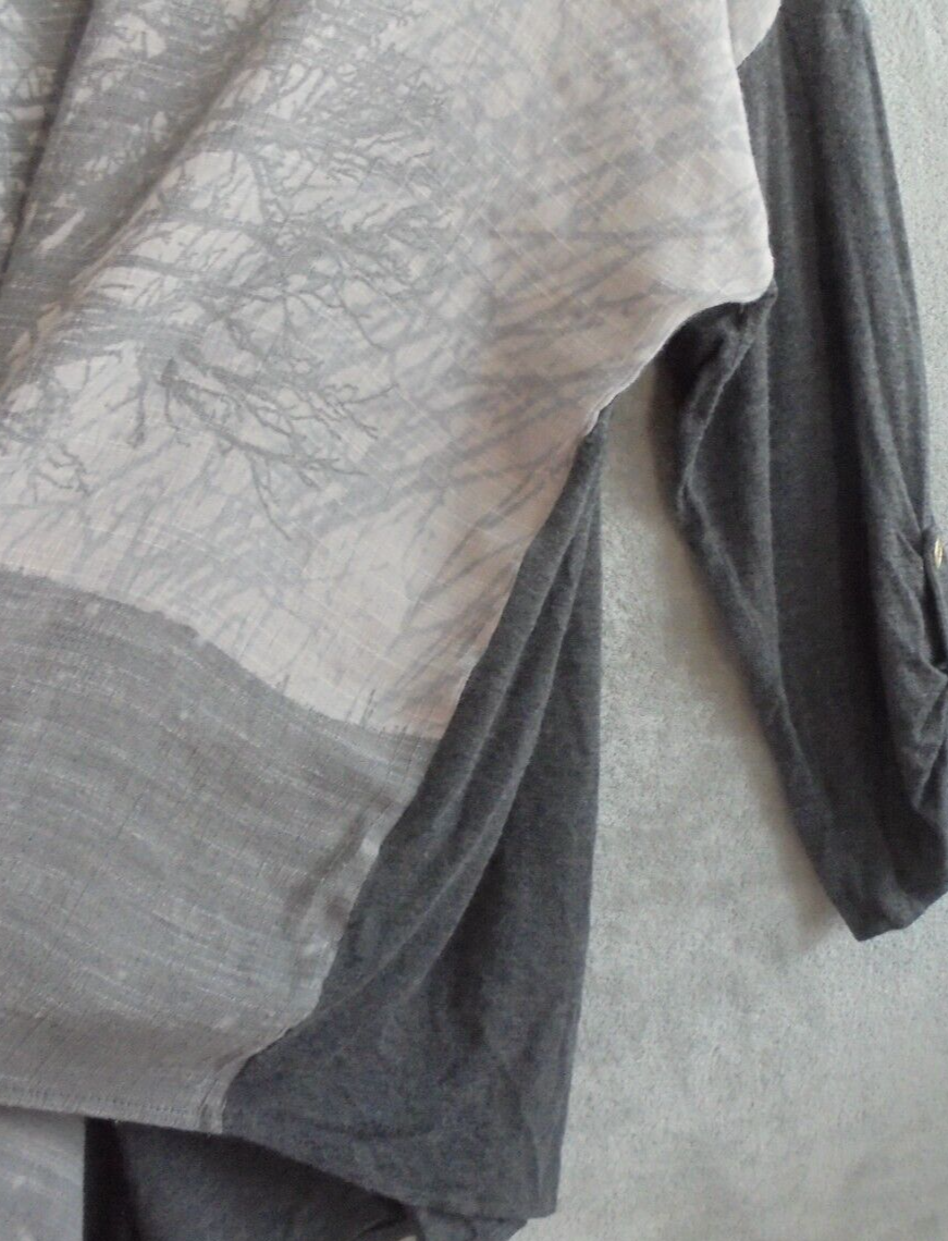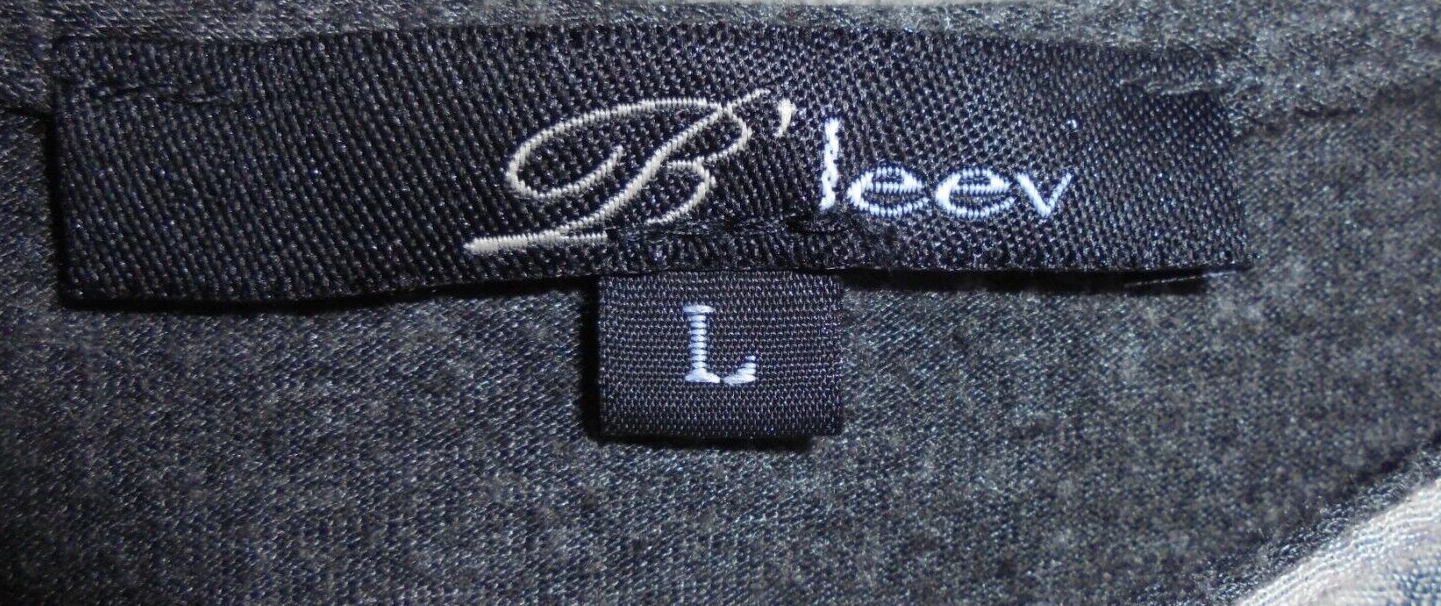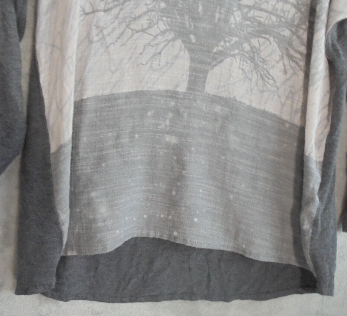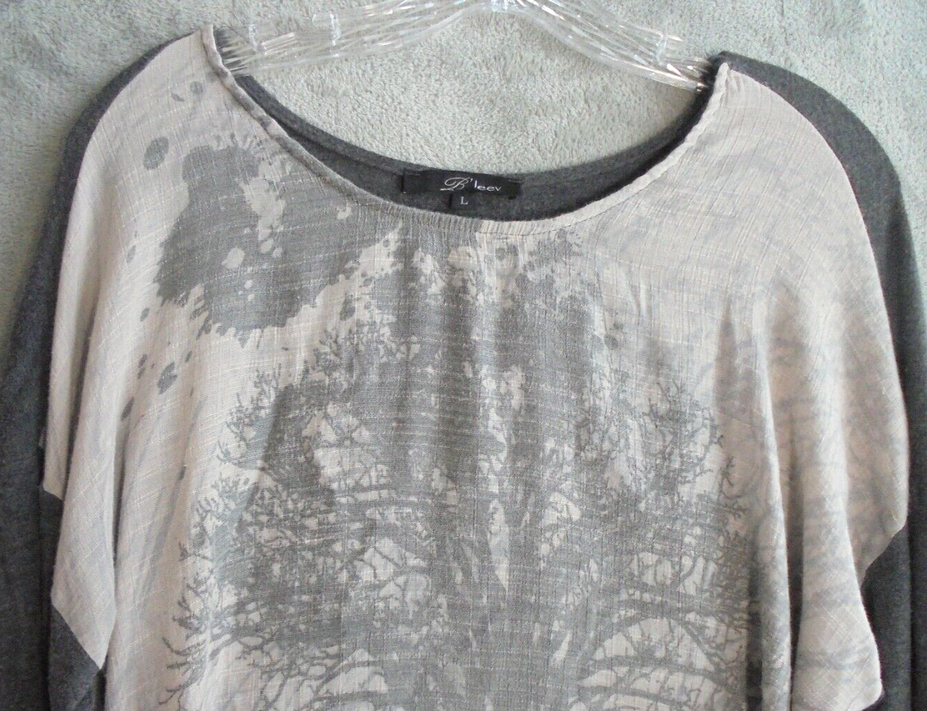 B'Leev Womens Large L Top 3/4 Roll Tab Sleeves Stretch Knit Gray Tree Design
