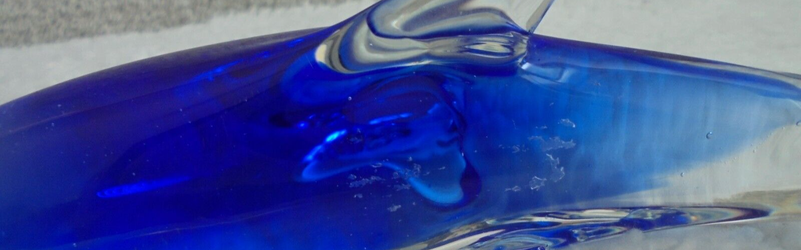 Description: Lovely blue and clear dolphin figurine. 6" long x 2.5"H x 2.5"D. For decoration, paperweight, etc.