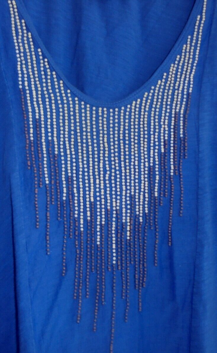 Description: Pretty top with beige and gray beads down front. Loose fitting, side slits.