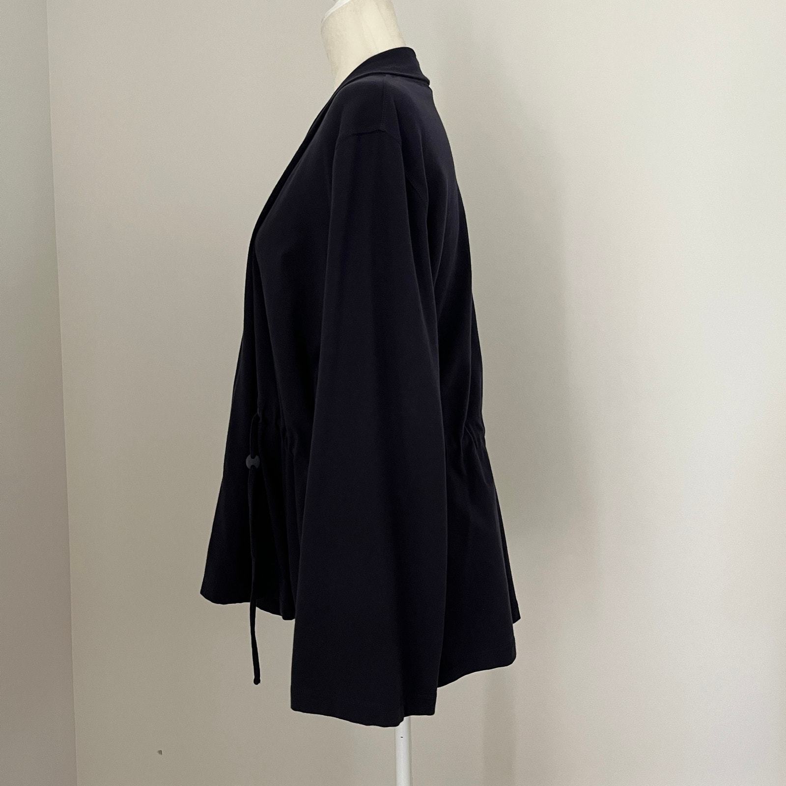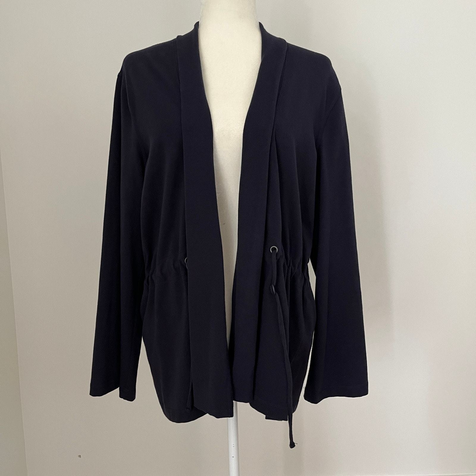 A versatile and timeless Eileen Fisher open-front cardigan jacket in a deep navy blue. Crafted from soft organic cotton stretch jersey, it offers a comfortable drape with just the right amount of stretch. Features long sleeves and an adjustable drawstring waist for a flattering, customizable fit. Lightweight and easy to layer, this piece works beautifully for both casual and polished looks.