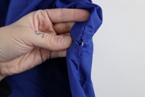 Tape over hole front top. Hole left armpit. Cuffs stretched and discolored. Blemish left arm