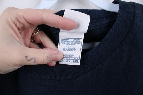 Stains collar, front top/bottom, back bottom. Collar discolored. Graphics, color faded. Pilling