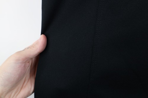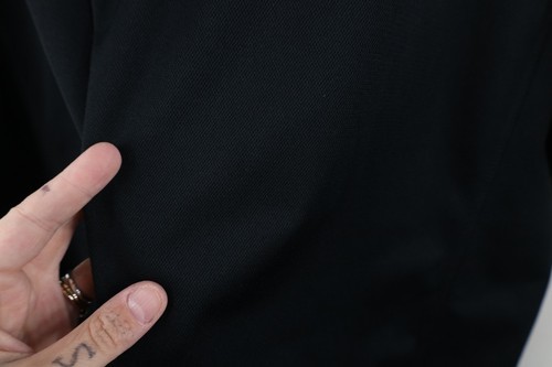 Dark spots front. Blemishes shoulders, front right. Design distressed. Pilling