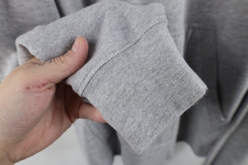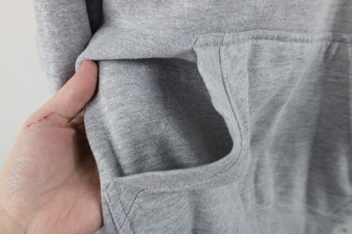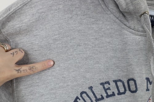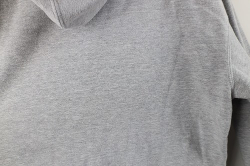 Dark spots front, pocket. String distressed. Hood, cuffs discolored. Graphics, color faded. Pilling