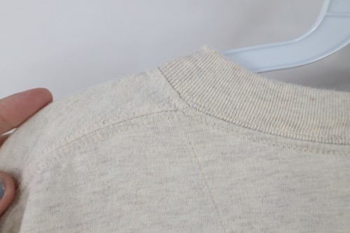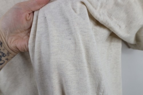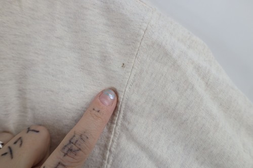 Hole left shoulder. Blemish front middle left. Color faded