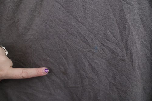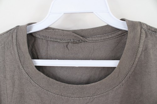Stains front bottom. Sleeves cut. Hole back of collar. Fabric pull right shoulder. Graphics faded. Color faded