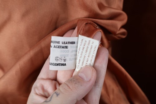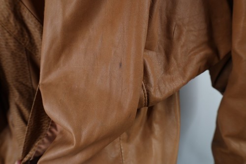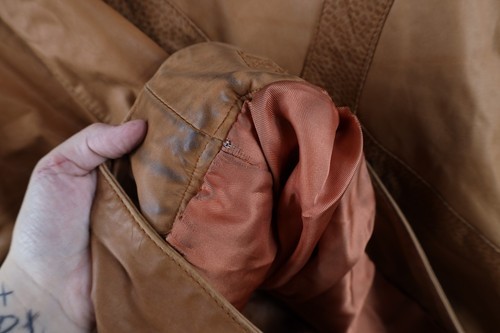 Stains/blemishes throughout, and cuffs. Collar, cuffs discolored/distressed. Inner lining holes, blemishes, is discolored. Distressed and faded