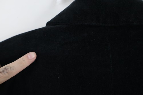Blemishes on back. Arms and inner cuffs discolored. Color faded