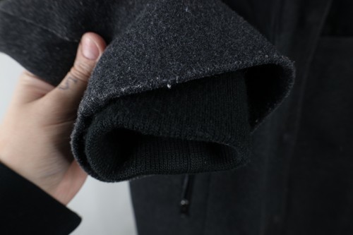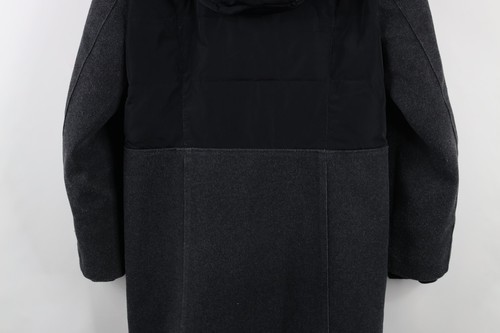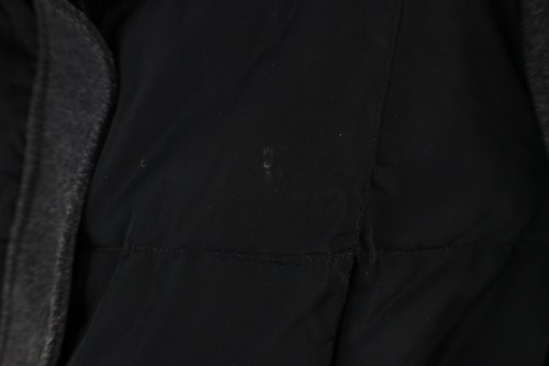Stains on front. Button areas front, and arms worn/discolored. Gray fabric pilled. Color faded. Hood can be removed