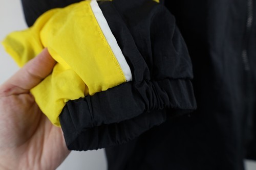 Blemishes front, arms. Loose threads cuffs, front, tag. Collar, cuffs discolored. Zipper pull discolored