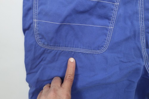 Thread bare spot back left leg near pocket. Blemishes/discoloring throughout. Thread bare fly. Button fly. Color faded