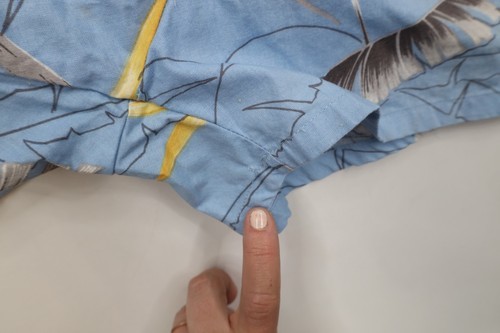 Hole inner left leg. Blemishes/loose thread front crotch srea. String distressed. Inner lining discolored. Loose thread fly. Color faded. Made in USA