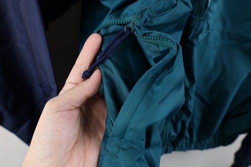 Blemishes throughout, and inner lining. Collar, cuffs discolored. Hood can be zipped into collar. String distressed.