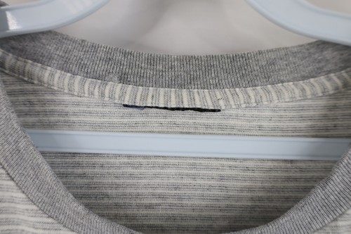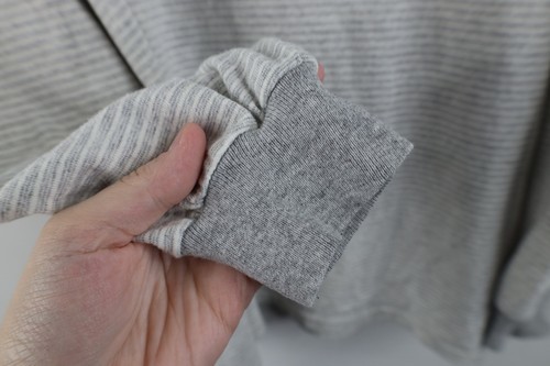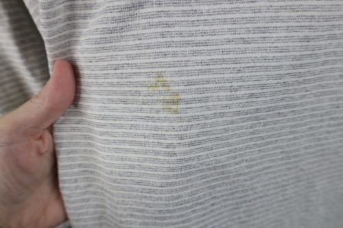 Stains front. Loose thread inner collar. Collar, cuffs discolored. Color faded. Pilling